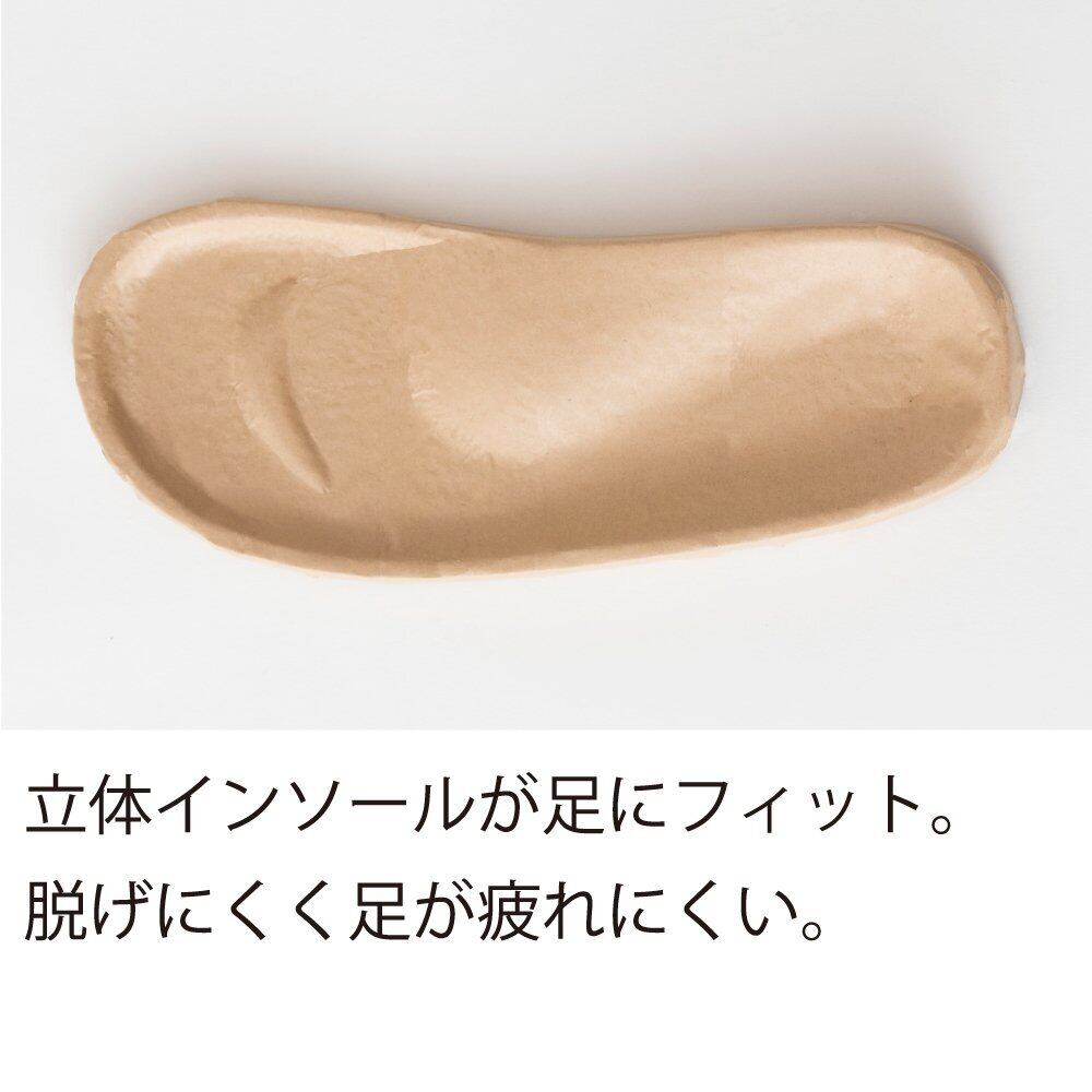 立体インソールが足にフィットし脱げにくく足が疲れにくい。かかとに弾力性があり軽量で快適な履き心地です。底面にはすべり止め付き。