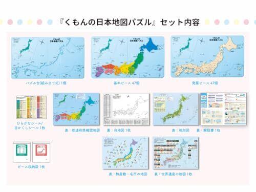 セット内容:パズル台(組み立て式)1個、基本ピース47個、発展ピース47個、都道府県名確認地図(裏:白地図)1枚、地形図(裏:解説書)1枚、特産物・名所の地図(裏:世界遺産の地図)1枚、ひらがなシール(めかくしシール)1枚、ピース収納袋2枚