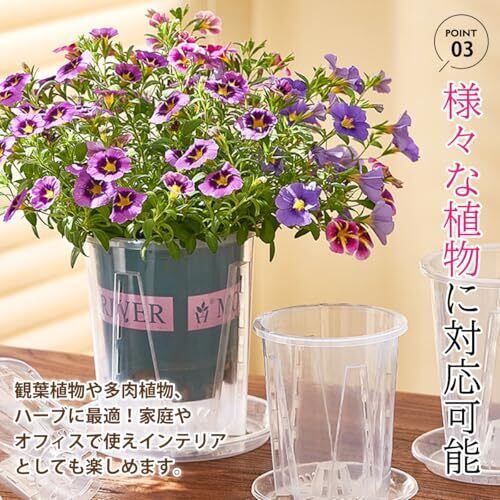 【光を多く取り込む透明PP樹脂】 このスリット鉢は、透明なPP樹脂素材を使用しており、通常の陶器やテラコッタとは異なり、根まで光を多く取り込みます。光を通すことにより、植物の成長が促進され、より元気に育ちます。さらに、透明素材のため、植物の根の様子を観察することができ、根腐れなどの異常も早期に発見できます。育成の楽しみが広がり、成長過程をリアルタイムで楽しめます。