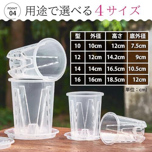 【軽量で丈夫な耐久性】 透明スリット鉢は、軽量かつ耐久性に優れています。耐圧性や耐腐食性にも優れており、長期間使用しても変形や劣化が少ないため、庭やベランダ、玄関先、屋内外のどちらでも使用が可能です。取り扱いが簡単で、移動も容易。植物が成長して重量が増しても、鉢自体は軽いため、植物の育成環境を常に最適に保てます。 【セット内容】10型5個セット【サイズ】外径:10㎝、高さ:12㎝、底外径:7.5㎝