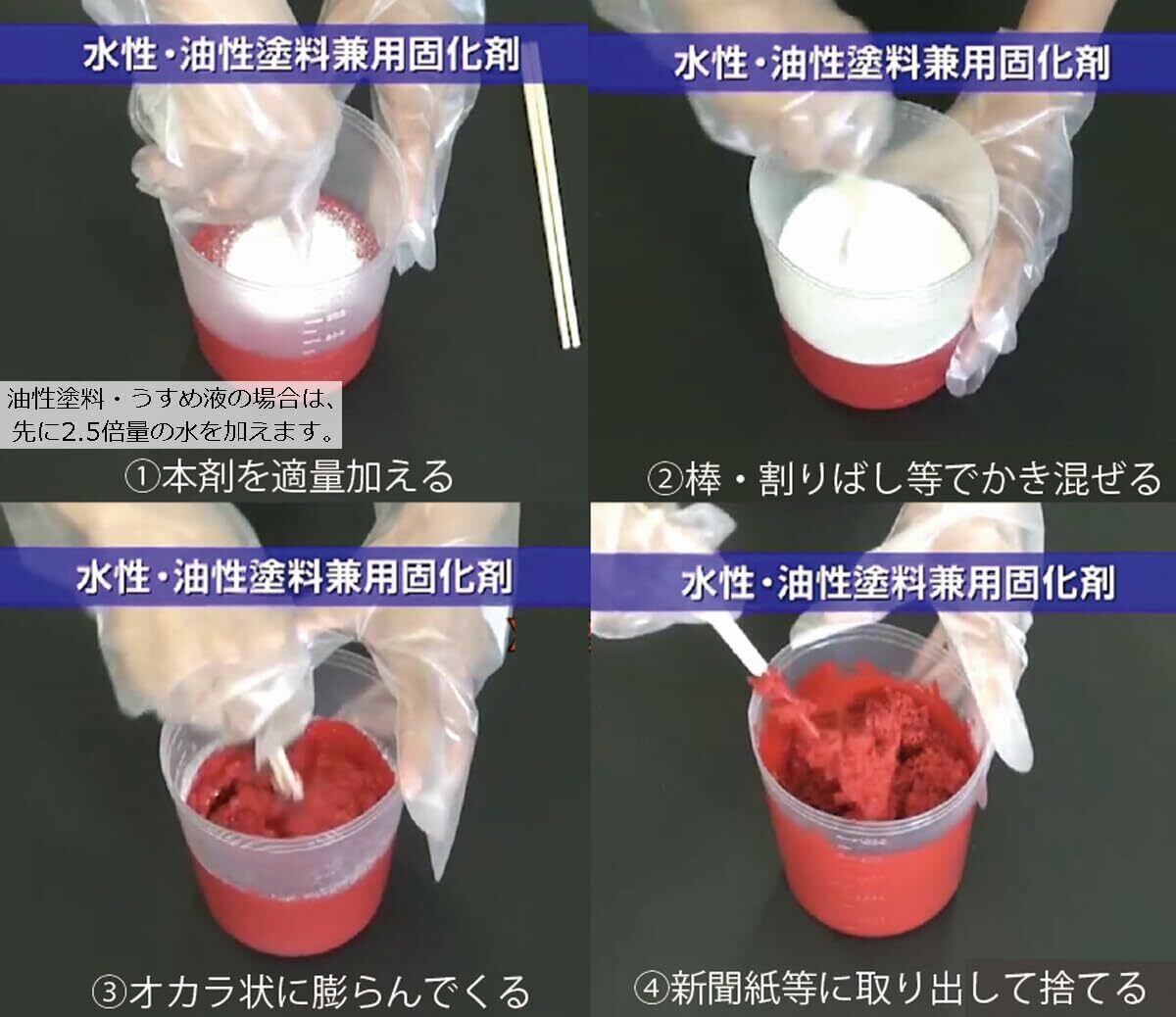 残った水性塗料や油性塗料に混ぜるだけで簡単に固化できます。