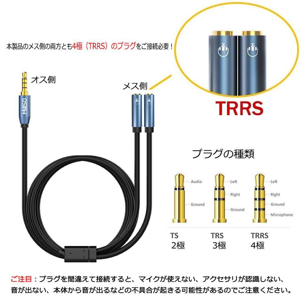 【ご注意】当音声分配ケーブルは、4極のイヤホン&マイク端子から、イヤホンとマイクを分離するケーブルではありません。メス側の両方とも4極(TRRS)の仕様です!4極プラグ及び3極プラグを同時的に接続すれば、イヤホンのマイク機能が使用できません。例えば:Switchでイヤホンマイクとスピーカーを同時に使う場合は、4極をスピーカーとマイクに分岐するケーブル(別途で買う)を使う必要があります。