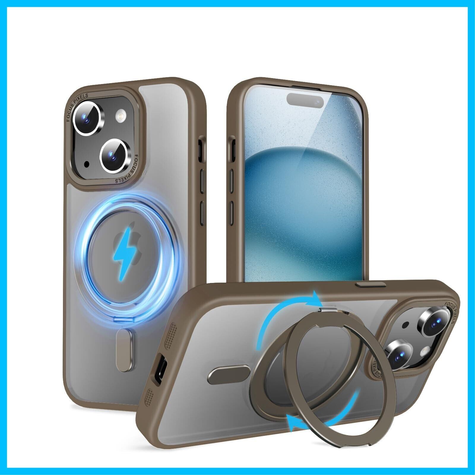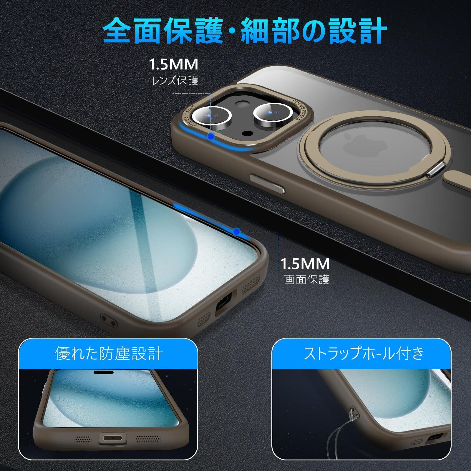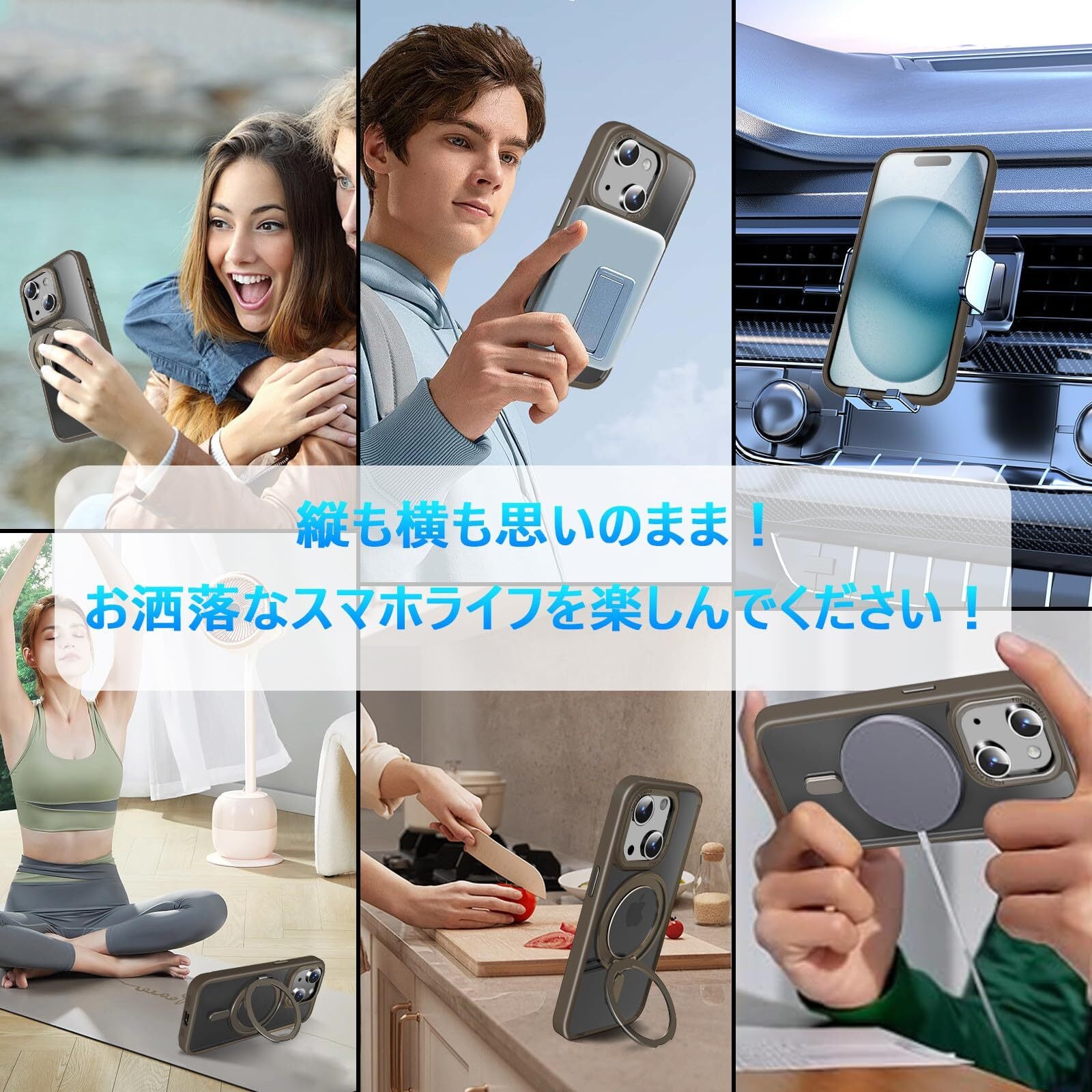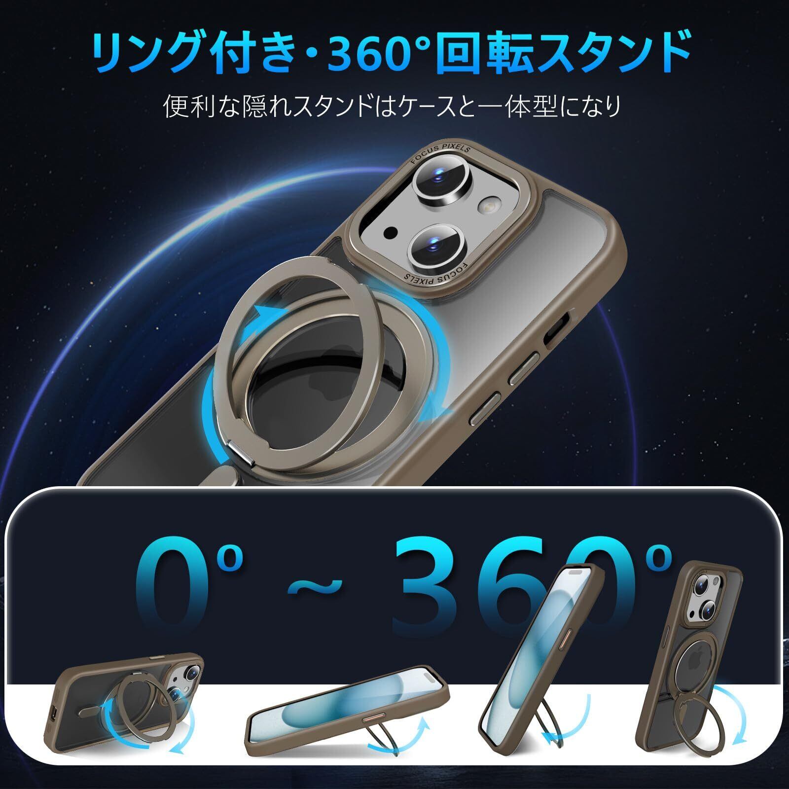 QUEASON【iPhone 15 用 MagSafe対応 ケース】360°回転スタンド ワイヤレス充電対応 iphone15 ケース リング付き 米軍MIL規格 iphone 15 ケース magsafe 超強磁力 落下防止 アイフォン15 ケース 耐衝撃 iphone15ケース 半透明 防指紋(デザートチタニウム)