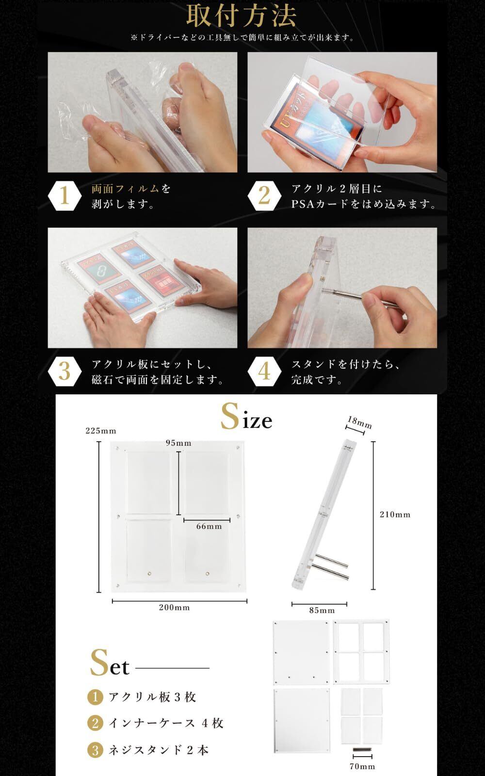 【あなたの大切なカードに高級感を】高透明度のクリアアクリルを使用。厚さ18mmで前面にダイヤモンドカット可能を施すことで重厚感と高級感を演出しました。見る角度でキラッと光り光沢感を持たせます。この厚みとダイヤモンドカットがカードの魅力を引き上げてくれます。 マグネットローダー本体と3枚のインナーケース、2本のスタンドネジで 工具不要 で組み立てられます。