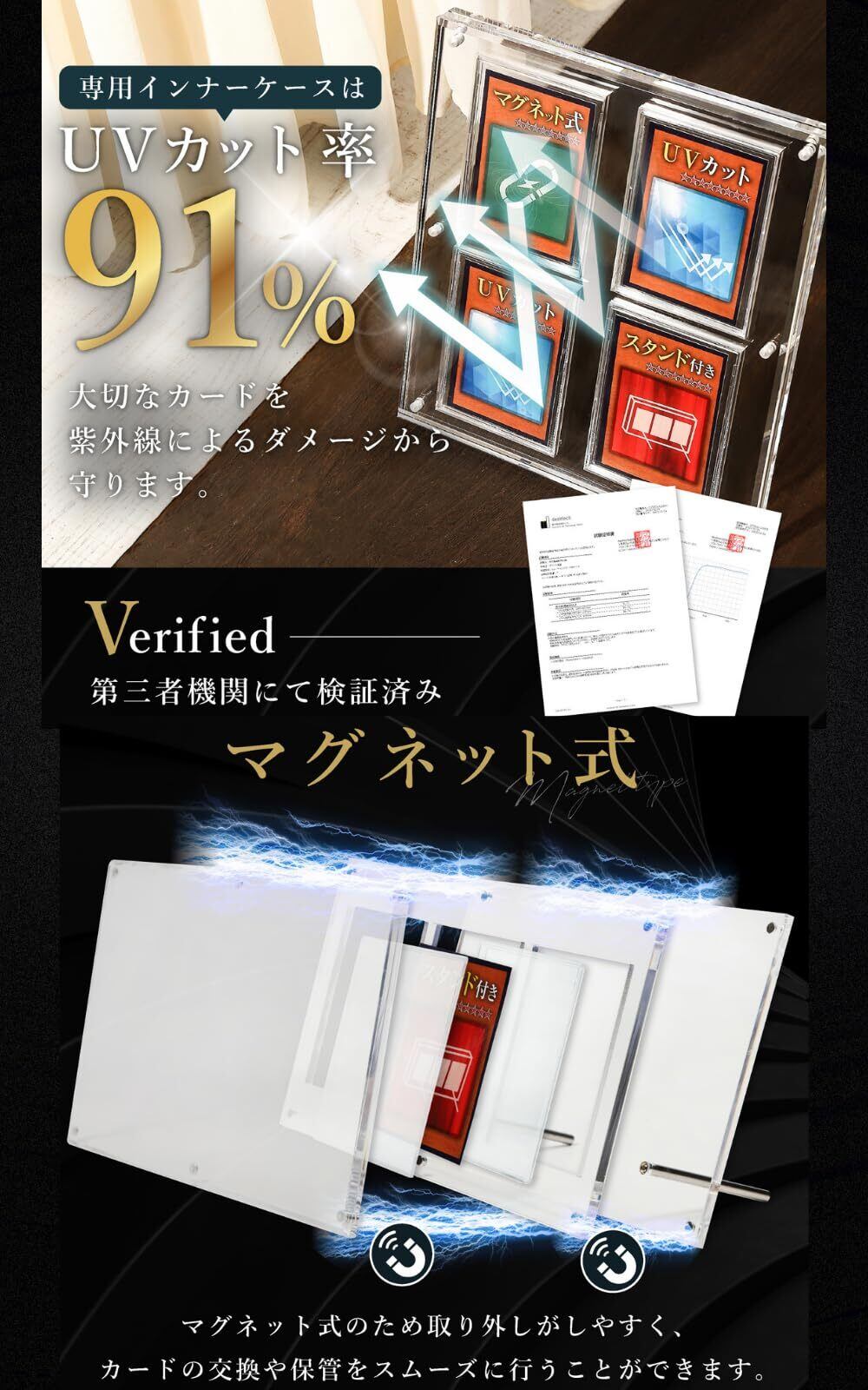 【両面UVカット率 91%】専用のインナーケースに UVカット機能 を搭載。日焼けによる変色、劣化、色褪せを防ぎ、大切なカードを 紫外線 によるダメージから守ります。蛍光灯の光でもカードが 色落ち することなくディスプレイ可能です。第三者機関にて試験済み