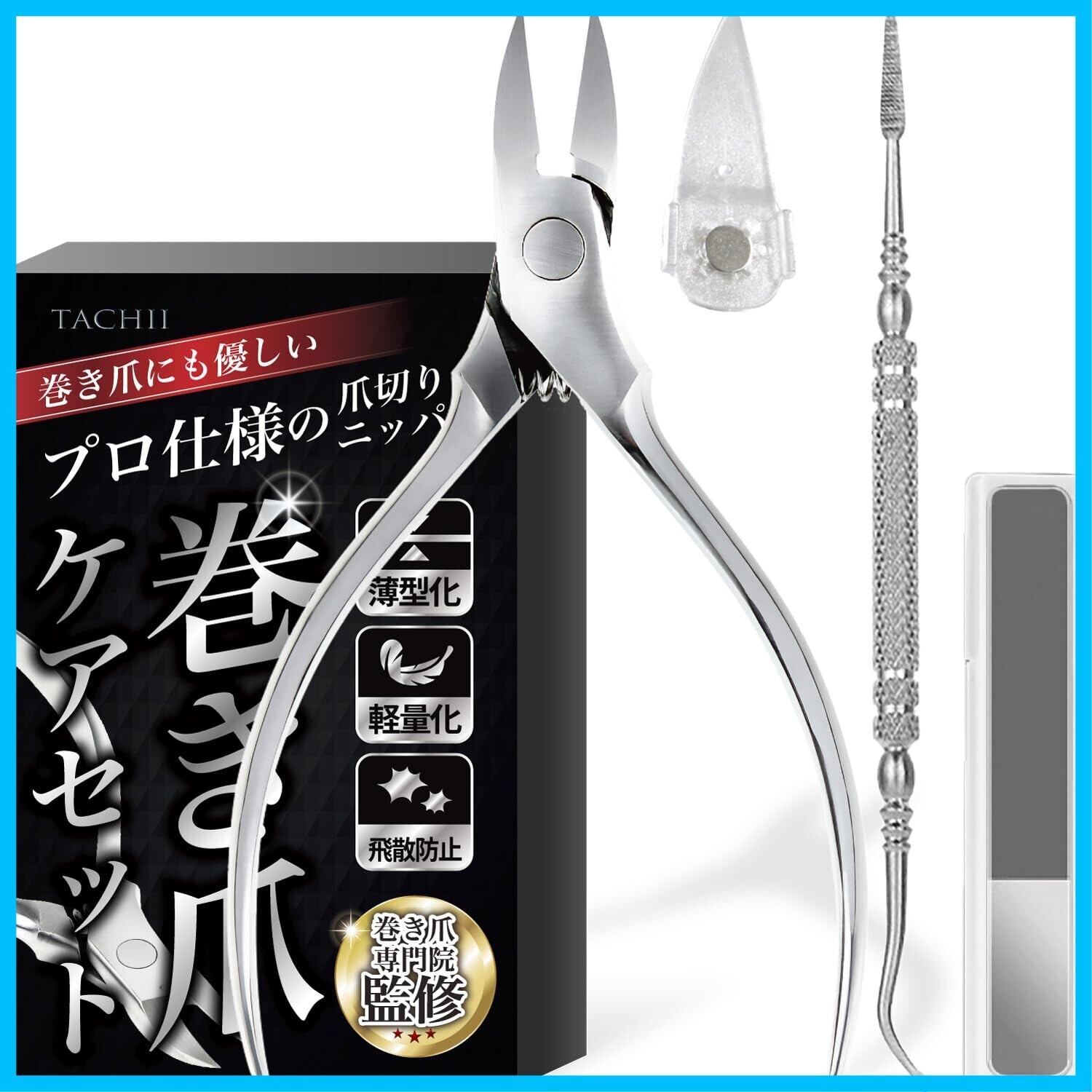 TACHII 巻き爪 爪切りニッパー 【巻き爪 専門院監修】 高硬度ステンレス製×匠の技巧|肥厚爪・陥入爪・足用OK|セルフネイルケアセット(爪やすり・ゾンデ・飛散ガード付)