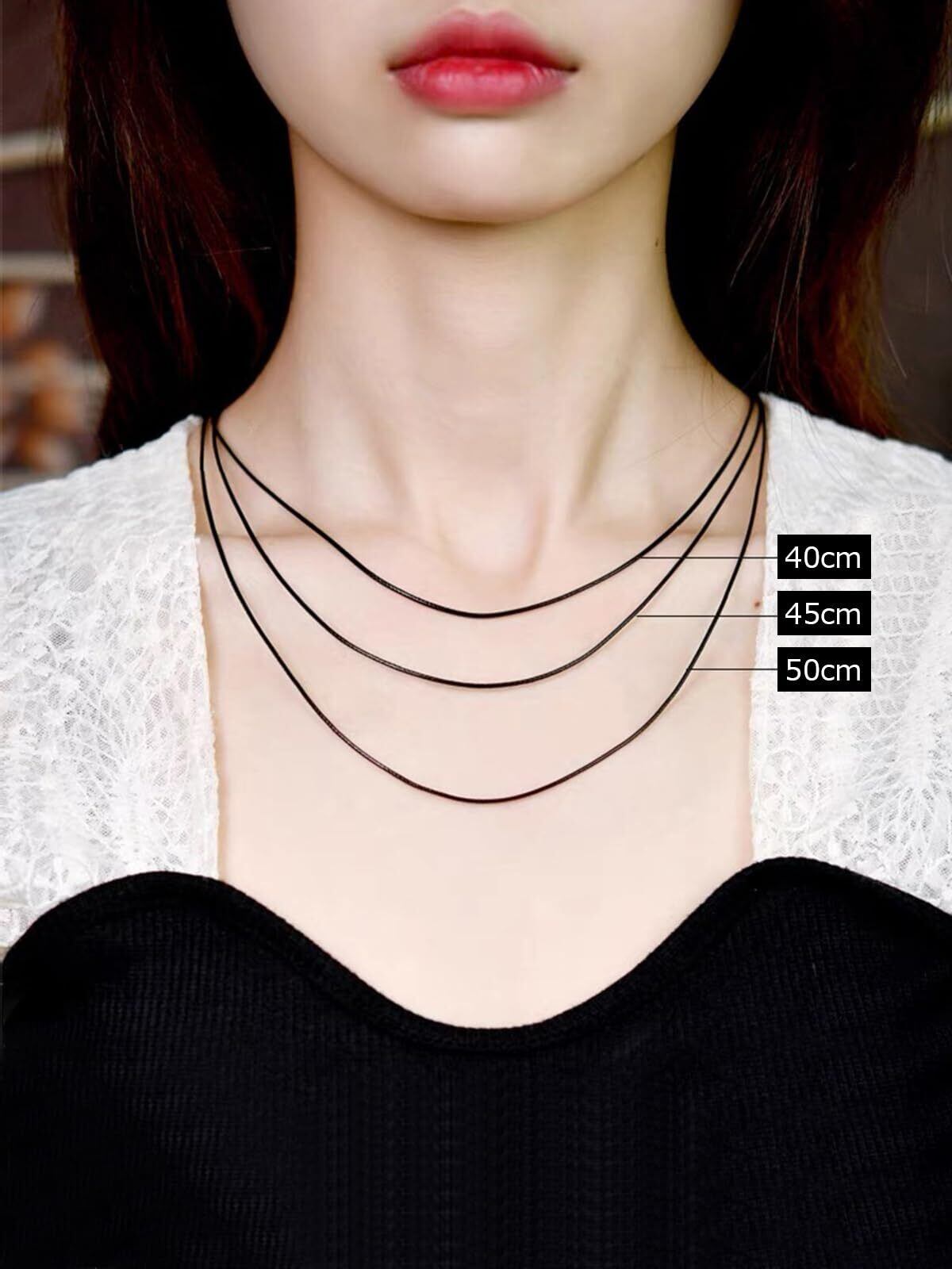 【長さを調節できるネックレス】チェーンの幅は1mmで、長さは40cm、45cm、50cm、55cm、と60cmの5種類があります。約+5cmアジャスター付きます。長さを調節できるため、合わせるトップスによって好みの長さに着用可能です。