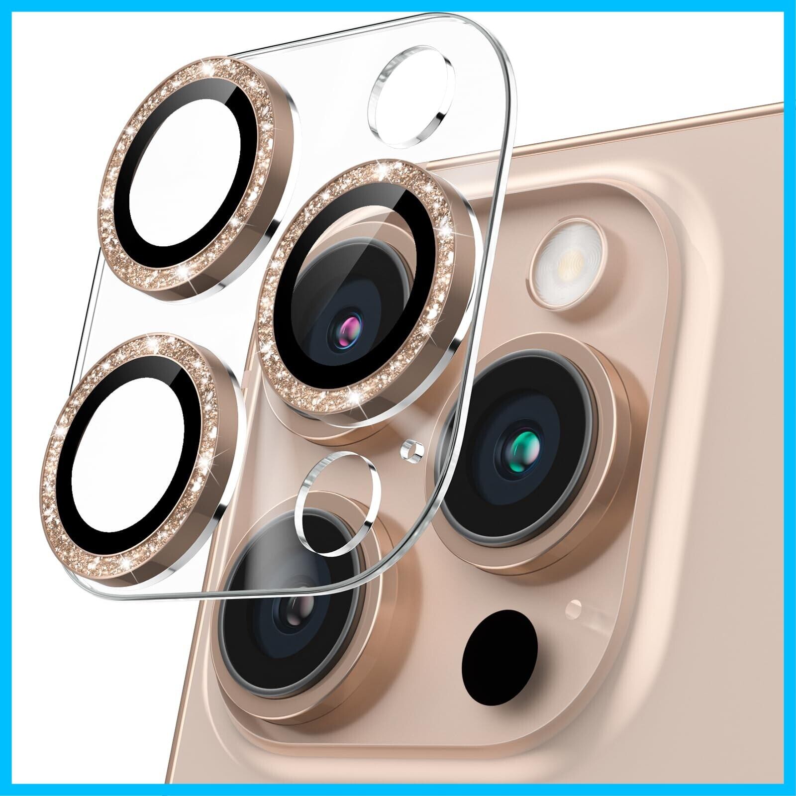 Podick カメラフィルム iPhone 16 Pro/16 Pro Max用 カメラカバー キラキラ 9H強化ガラス アルミ合金 アイフォン16プロ/16Pro Max用 カメラ保護 ピカピカ キズ防止 耐衝撃 高透過率 黒縁取り 露出オーバー防止 極薄 レンズカバー プロテクター ゴールド