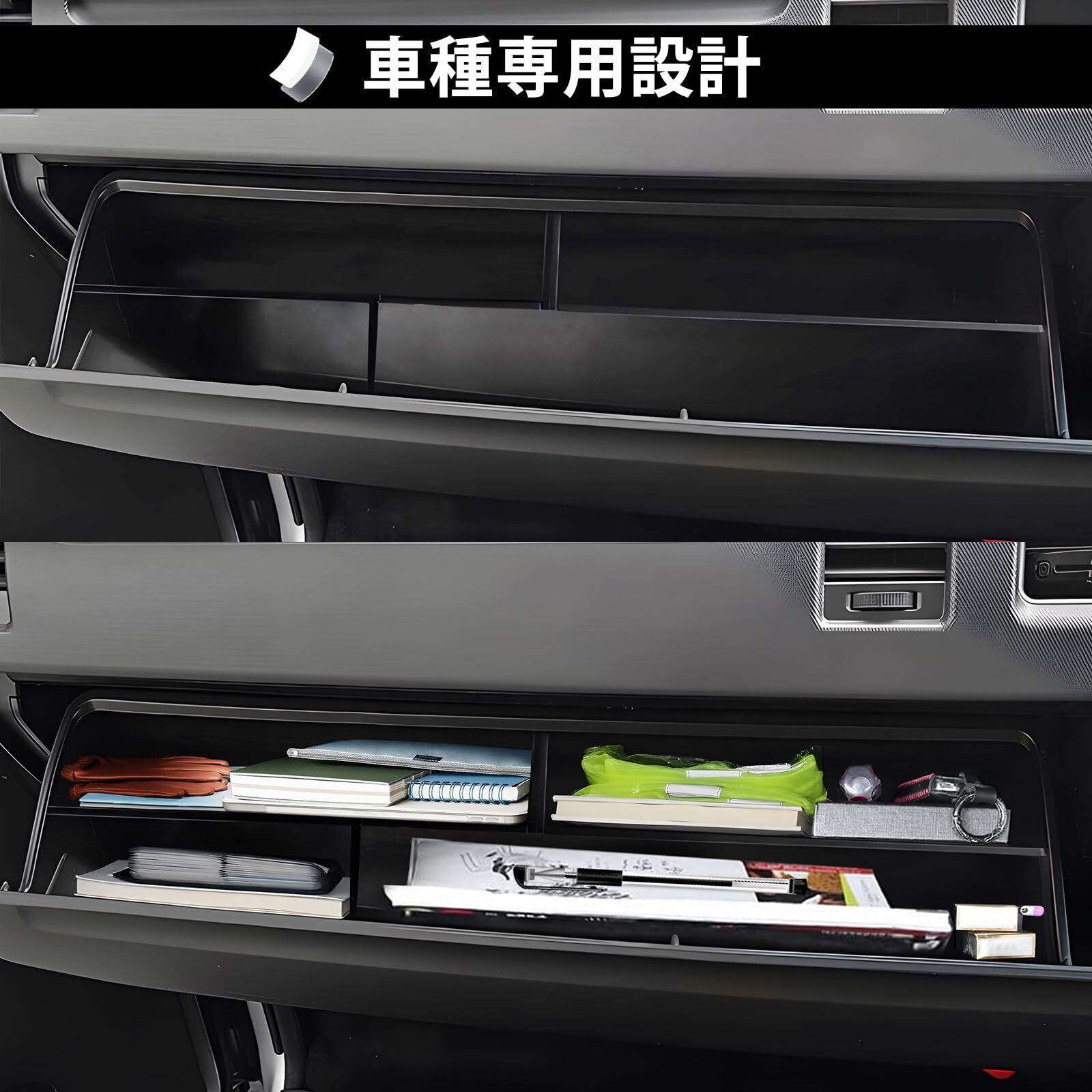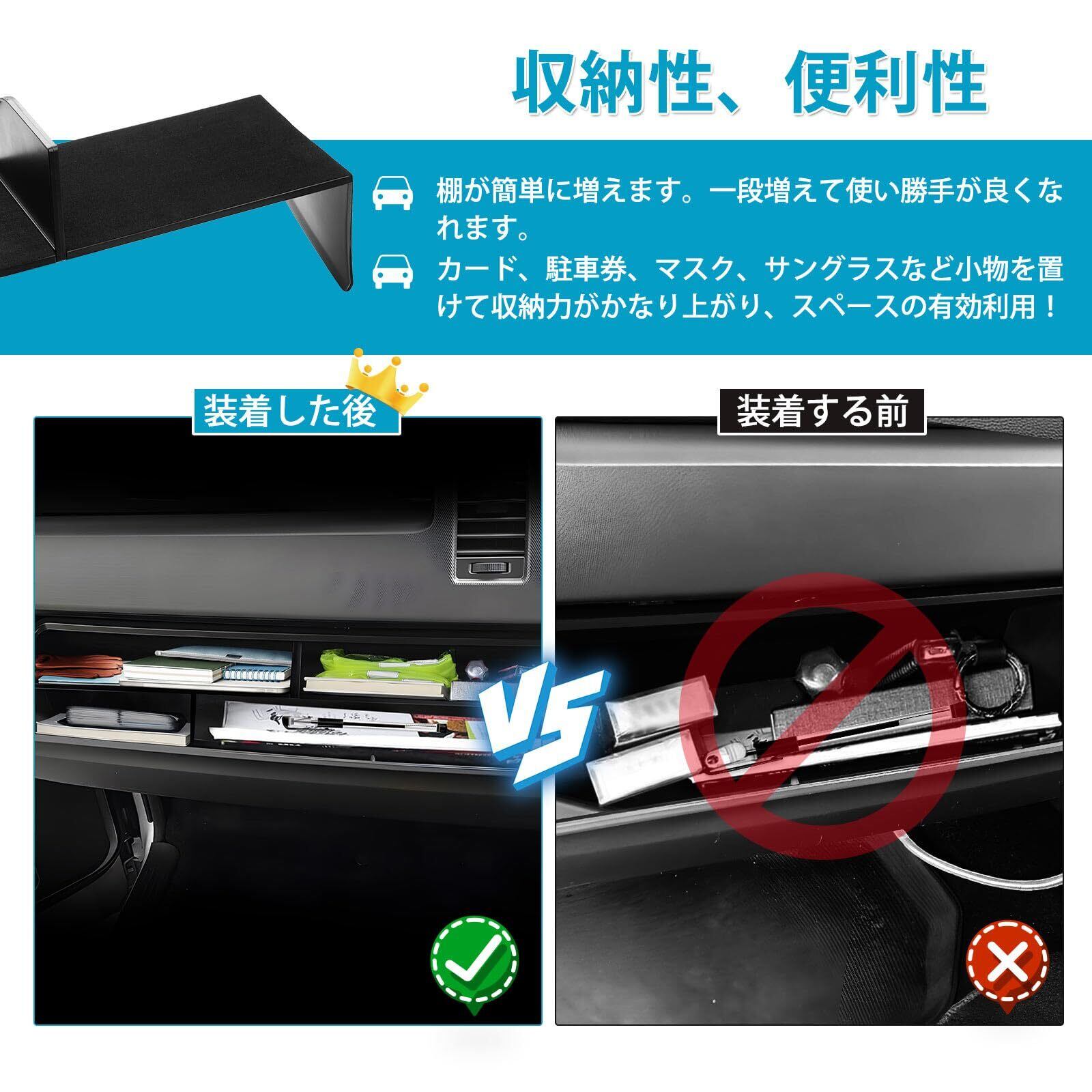 3.【収納性、便利性】:棚が簡単に増えます。一段増えて使い勝手が良くなれます。カード、駐車券、マスク、サングラスなど小物を置けて収納力がかなり上がり、スペースの有効利用!