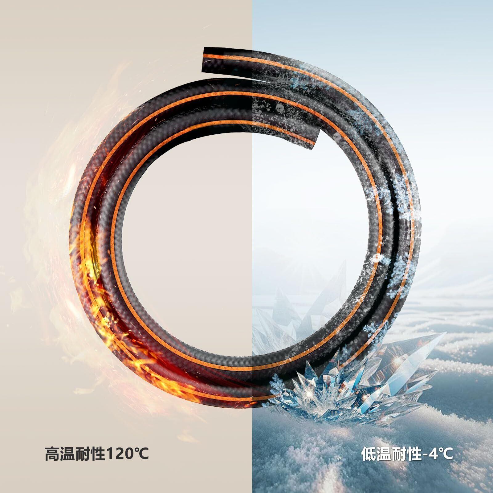 【三重構造で丈夫】しっかりの三重構造で、ホースはとても丈夫;内外層がニトリルゴム(NBR)採用で、中間層が耐圧構造の合成繊維メッシュを入れるため、作業圧力は300psi(20.6bar)、破裂圧力1200psi(82.7bar)に到達できます。