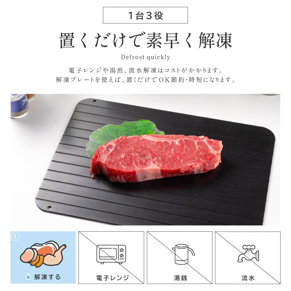 【置くだけで素早く解凍】電子レンジや湯銭、流水で解凍するとコストがかかりますが、解凍プレートは置くだけだから、電気も水も使わず時短で解凍できます。※実際の効果として、室温や食材の大きさ、解凍プレートの接触面積の大きさにより差異があります。