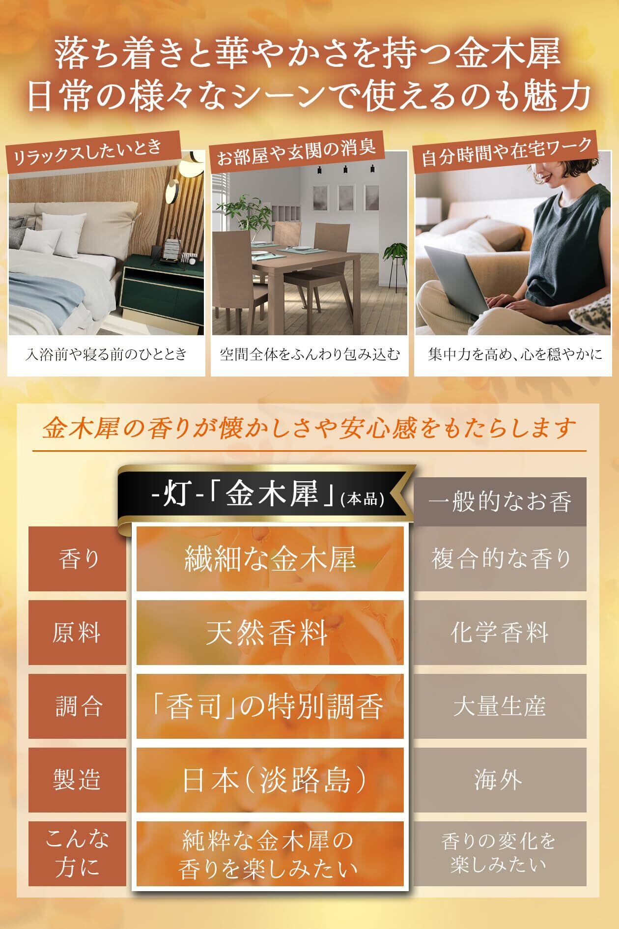 【秋風に香る甘くかぐわしい金木犀の香り】初秋の柔らかな風に乗って漂うほんのり甘い華やかな香り。金木犀香料を配合して自然な金木犀の香りを表現しました。華やかでフレッシュな香りから、時間経過とともに上品で少し甘みのあるフローラルノートが広がります。香りの移ろいが心地よい余韻を残してくれます。お線香やアロマの香りが苦手な方にもおすすめです。