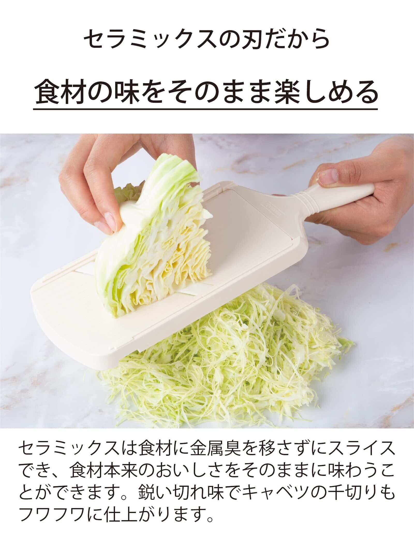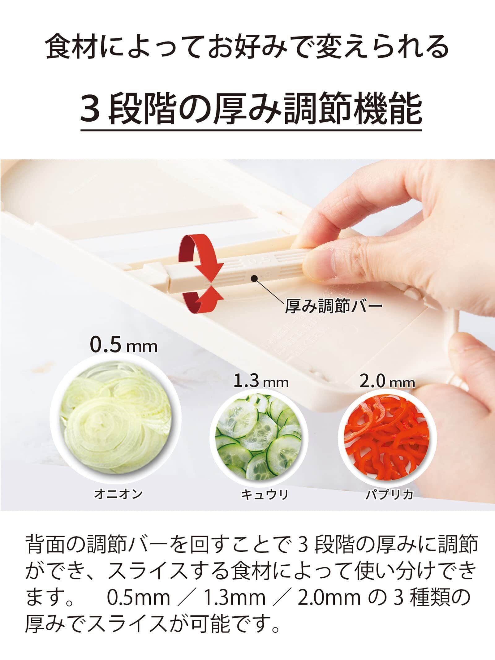 【厚み調節可能】ラバーグリップで握りやすい。セラミック刃だから「軽く、素早く、キレイに切れる」スライサー。3段階(0.5mm・1.3mm・2.0mm)の厚みに調節が可能。玉ねぎやきゅうり、パプリカ、キャベツなど食材によって使い分けられる。キャベツのせん切りも簡単