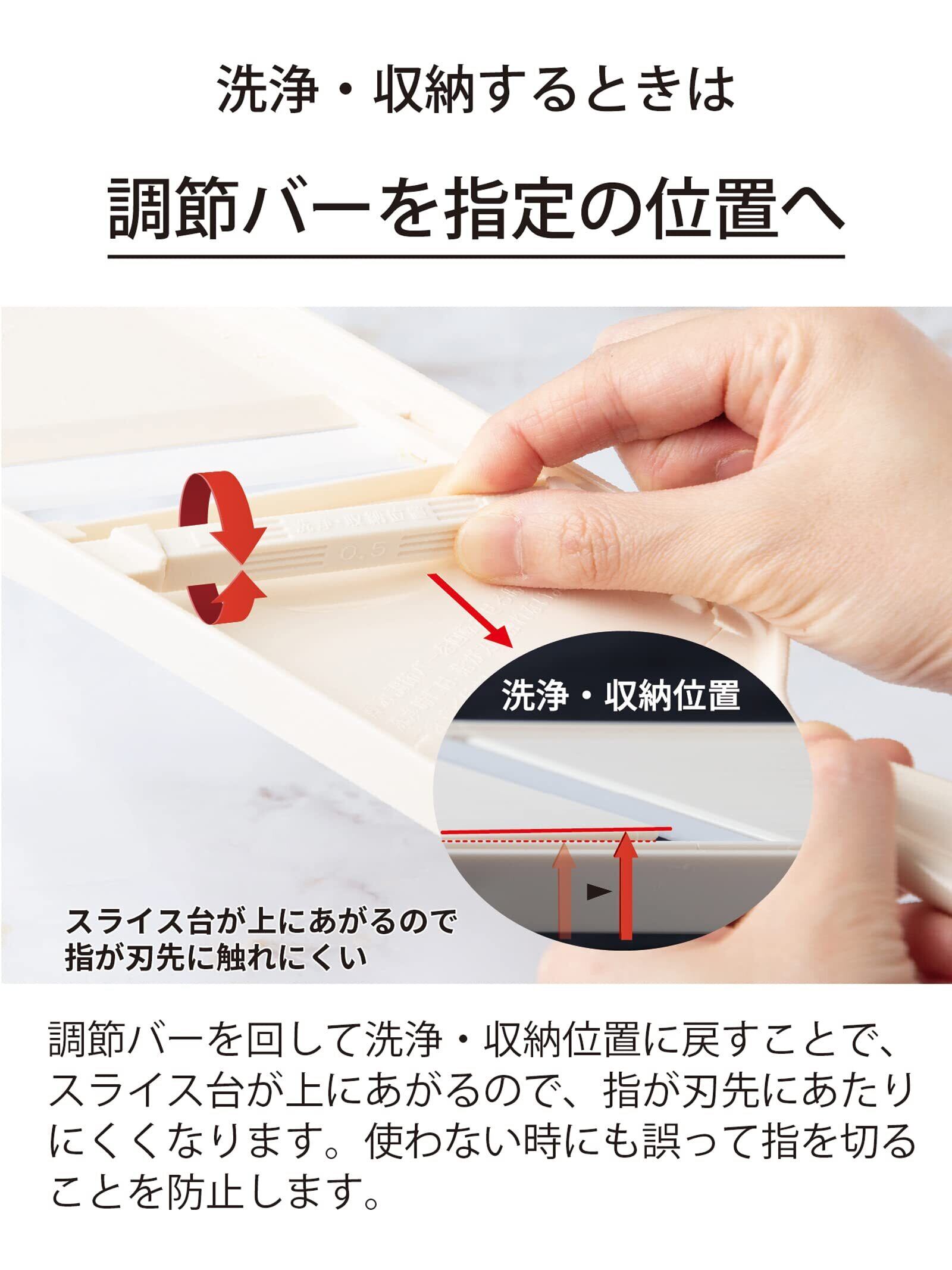 素材・材質:刃/ファインセラミックス、本体/ABS樹脂(耐熱温度:70度)、調節バー/ポリアセタール(耐熱温度:80度)、プロテクター/ポリプロピレン(耐熱温度:110度)
