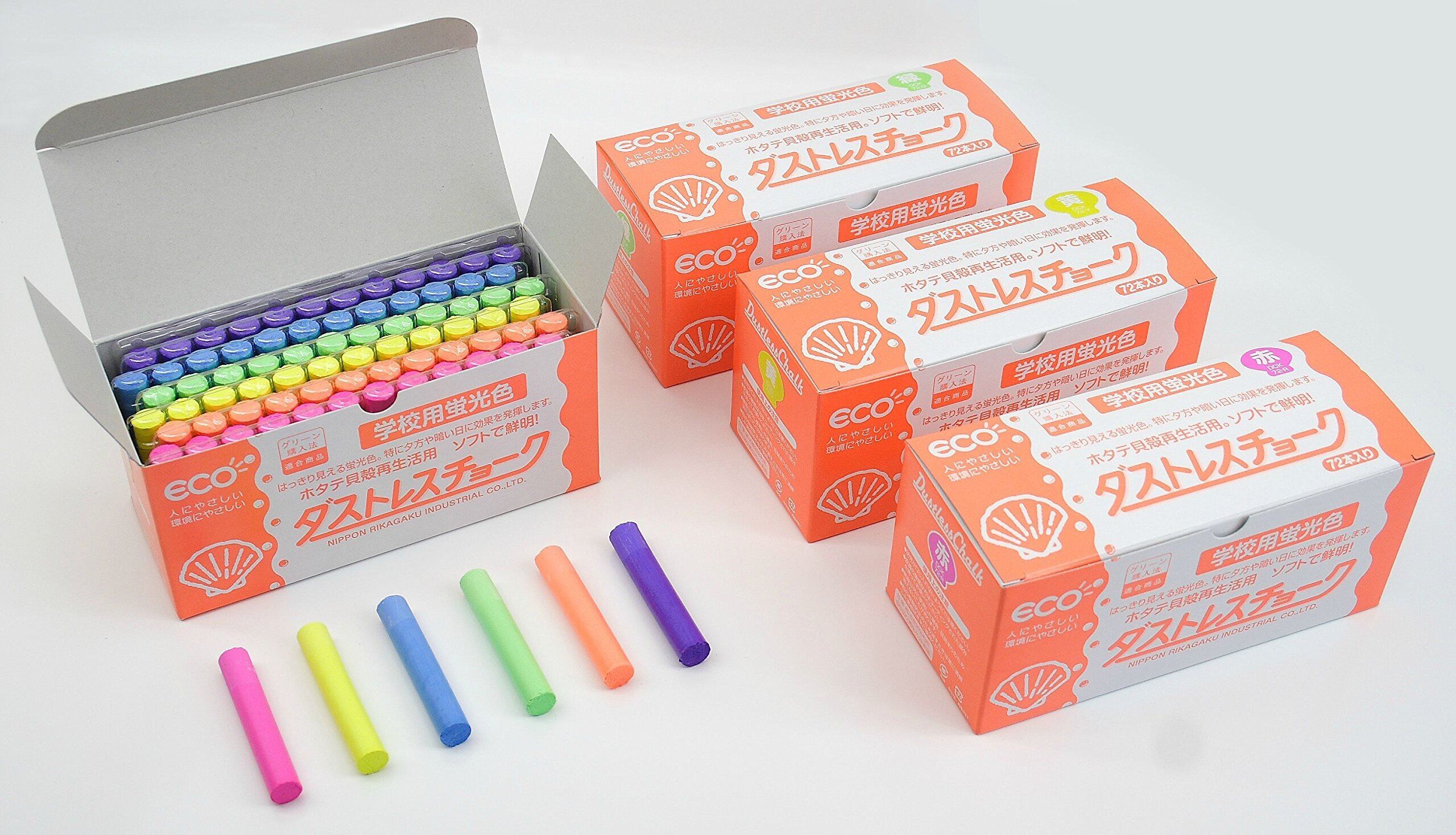 【セット内容】 ダストレス蛍光チョーク:蛍光4色(蛍光赤、蛍光黄、蛍光緑、蛍光橙)各18本 合計72本