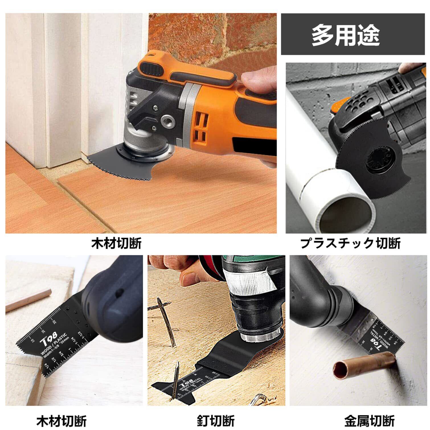 【多用途】T98ブレードカットソーセットは使用頻度高い、多用途のブレードカットソーをセットにして、木材・釘・金属切断、削り取り、際切り、深切り、タイル目地切断、切り込み、面取り、研磨表面仕上げ加工など幅広い作業に対応しています。