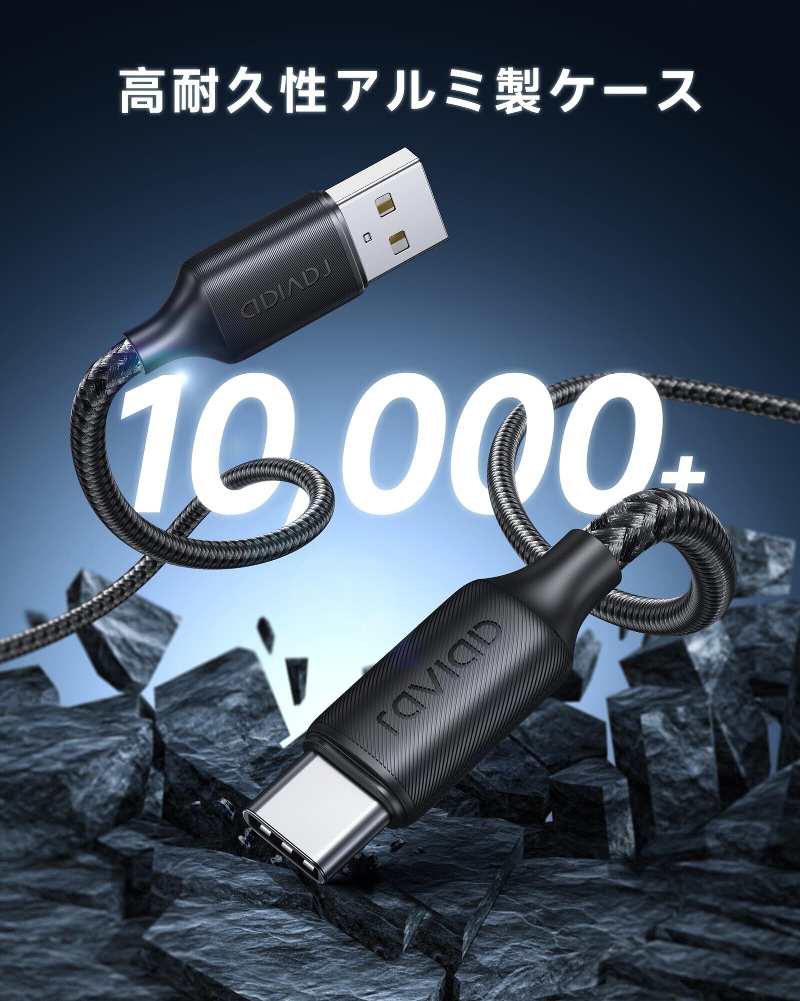 【卓越した耐久性】たいふc ケーブル 充電器 急速 ケーブル、高耐久を持つ断線しにくいナイロン素材を採用し、25,000回以上のケーブルの曲折テストに耐えることができます。コネクタはアルミ合金製で抜き差しの繰り返しに耐え、使いやすいです。