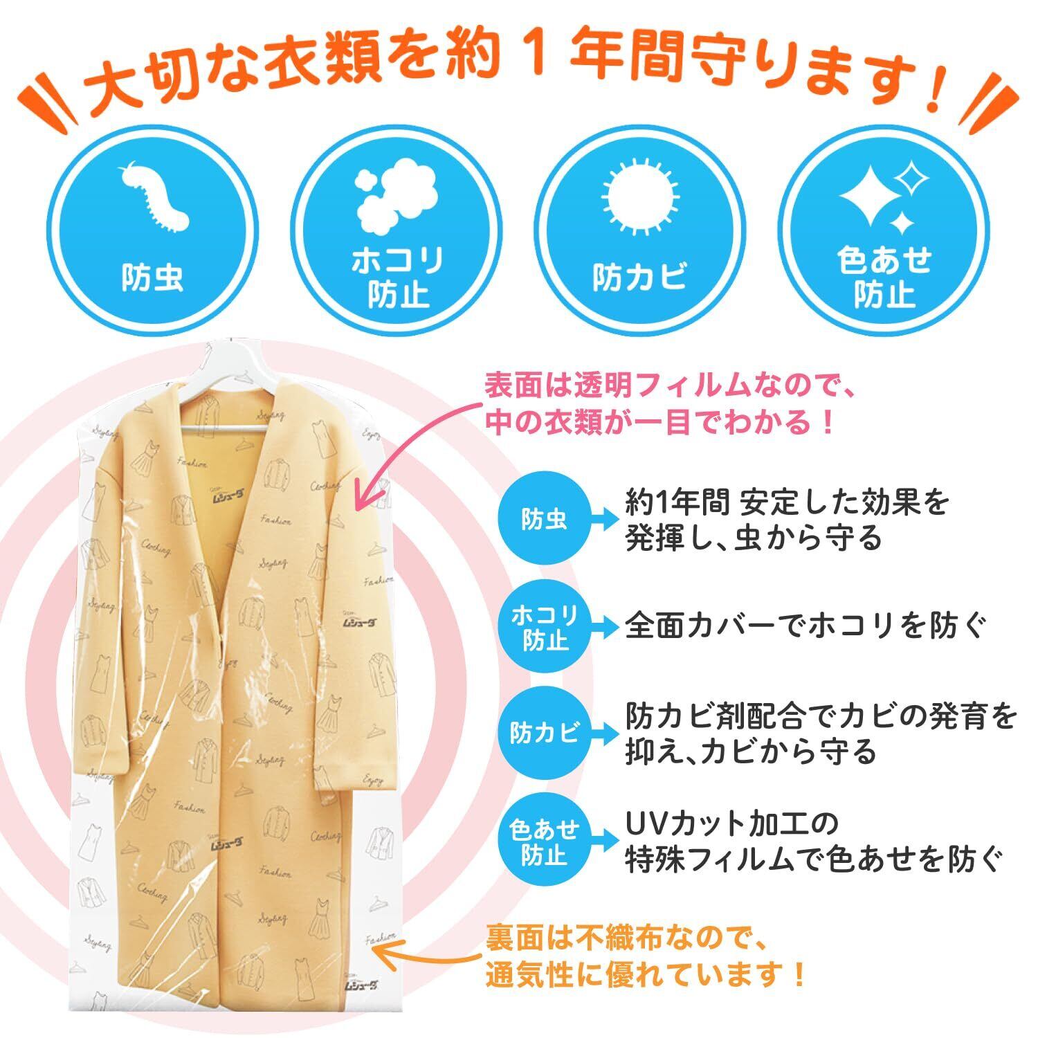 【虫とホコリから守る】カバーが衣類をホコリから守り、UVカット加工の特殊フィルムが色あせを防ぎます。防カビ剤配合。