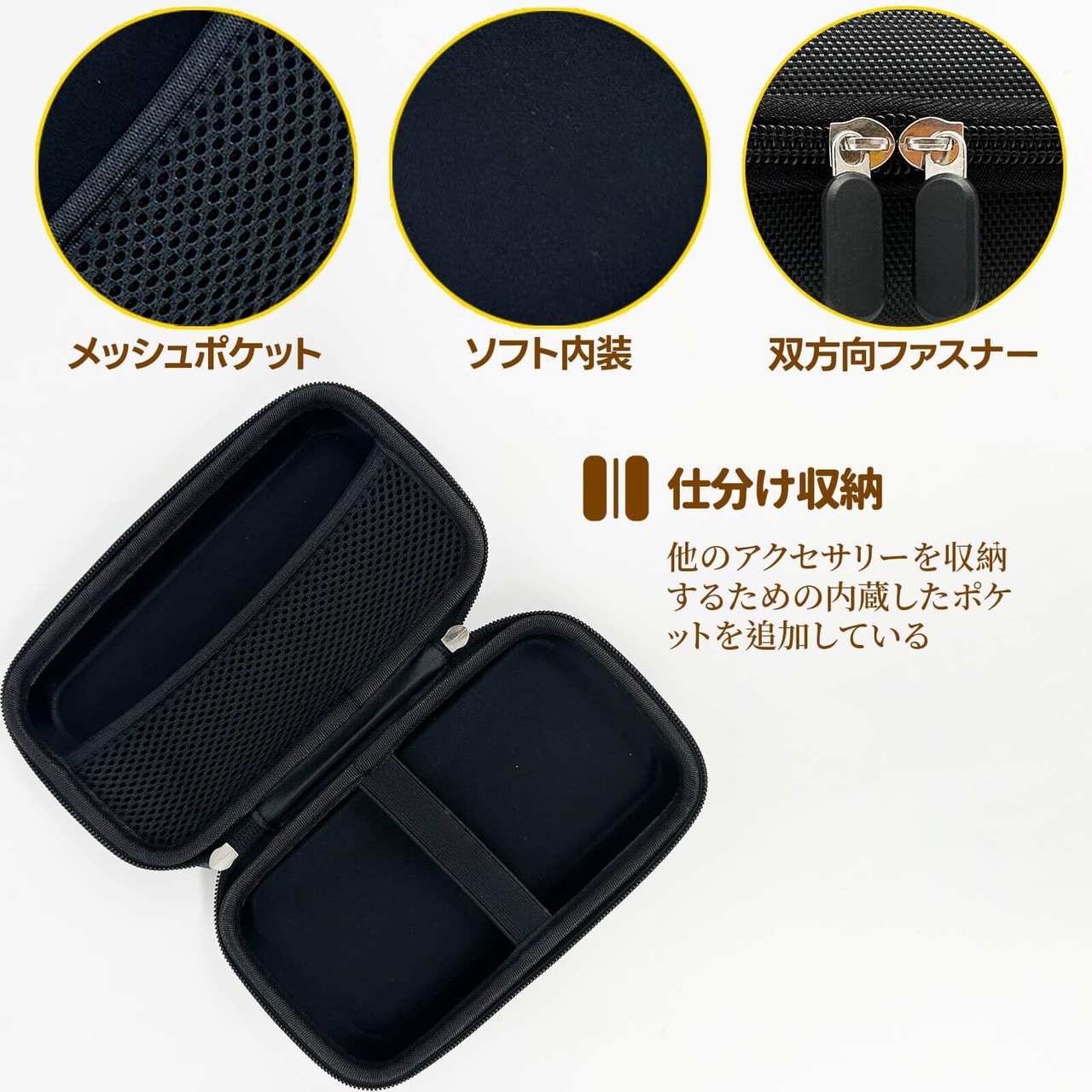 内側メッシュポケットで設計されて、小物やアクセサリーを収納できます;:丈夫でスームズな全開なファスナーにより、機器の取り出しが楽になる。