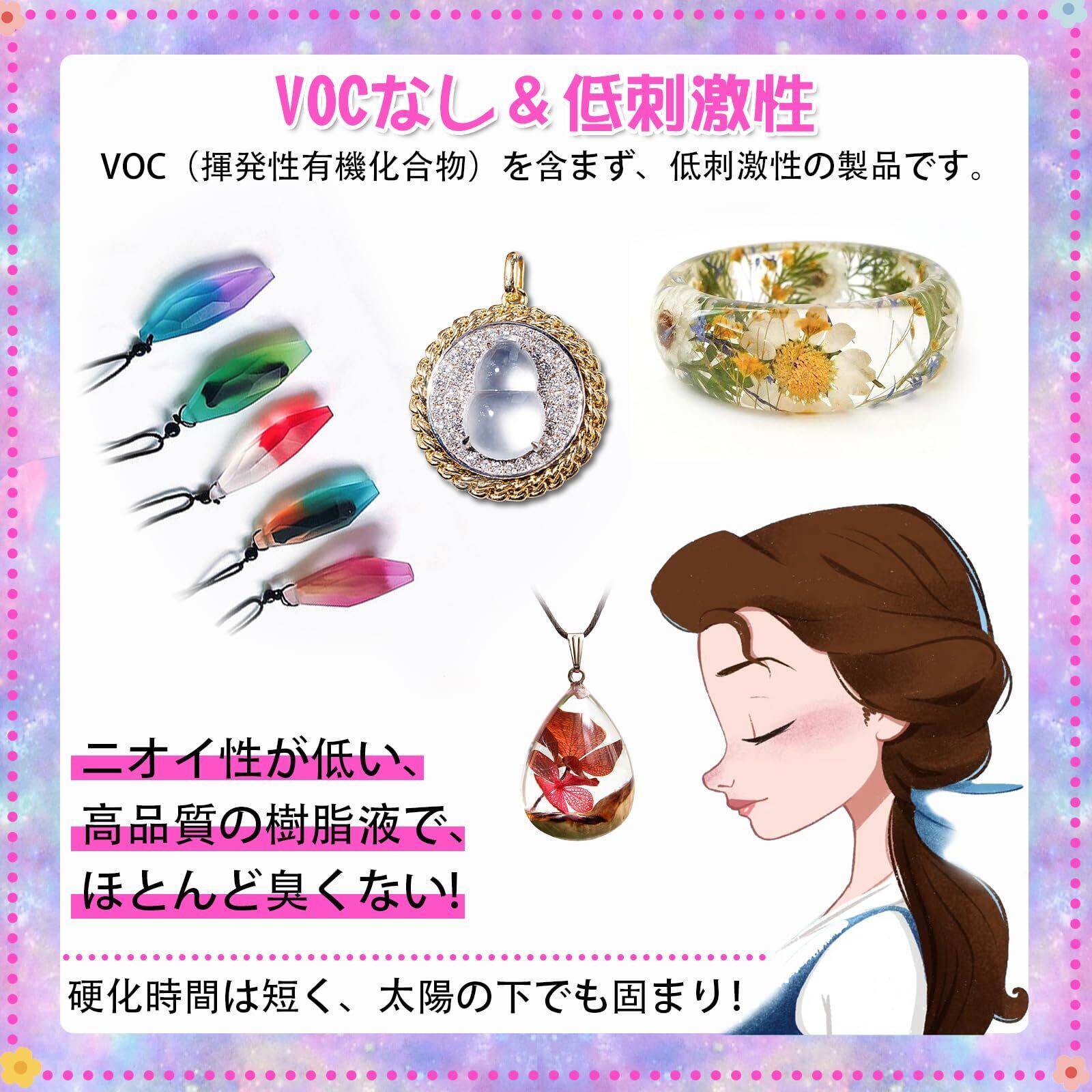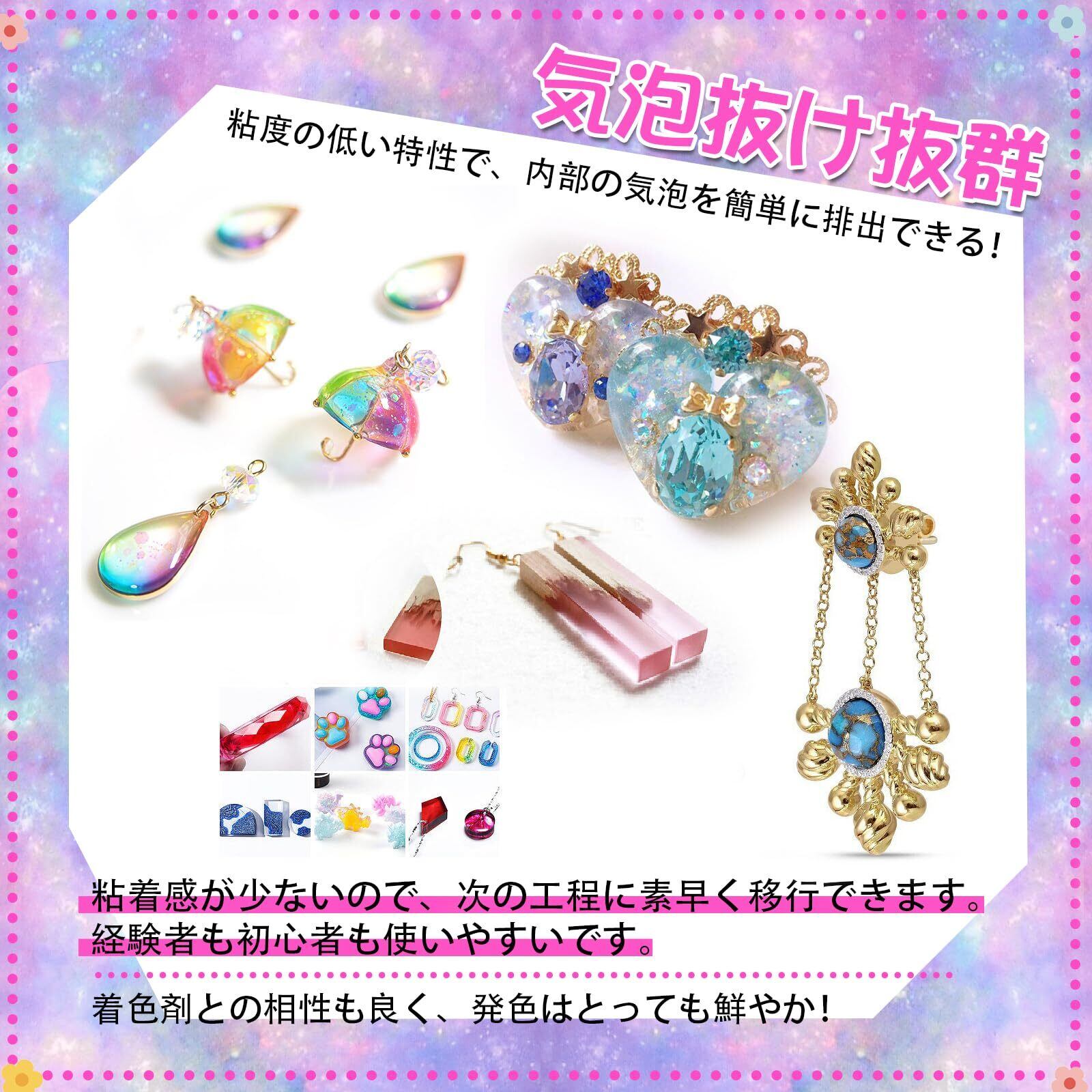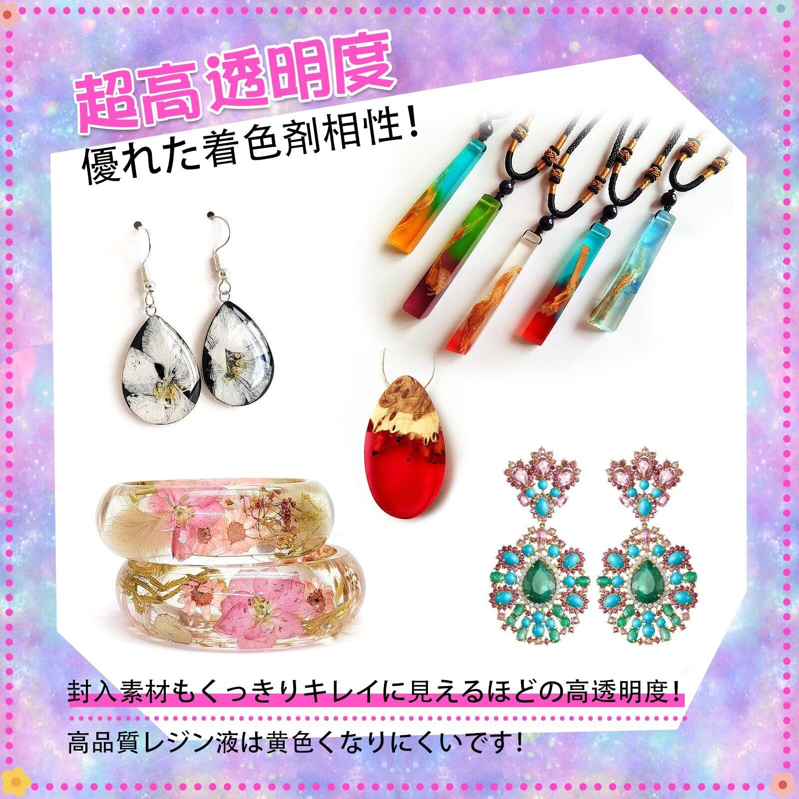 高品質レジン液:あなたがそれを作る時に、ほとんど気泡が全くありません。その匂いは低いです。 どんな環境でも作業できます。大容量 たくさんのものを作れます。保存は簡単、密封するだけ。