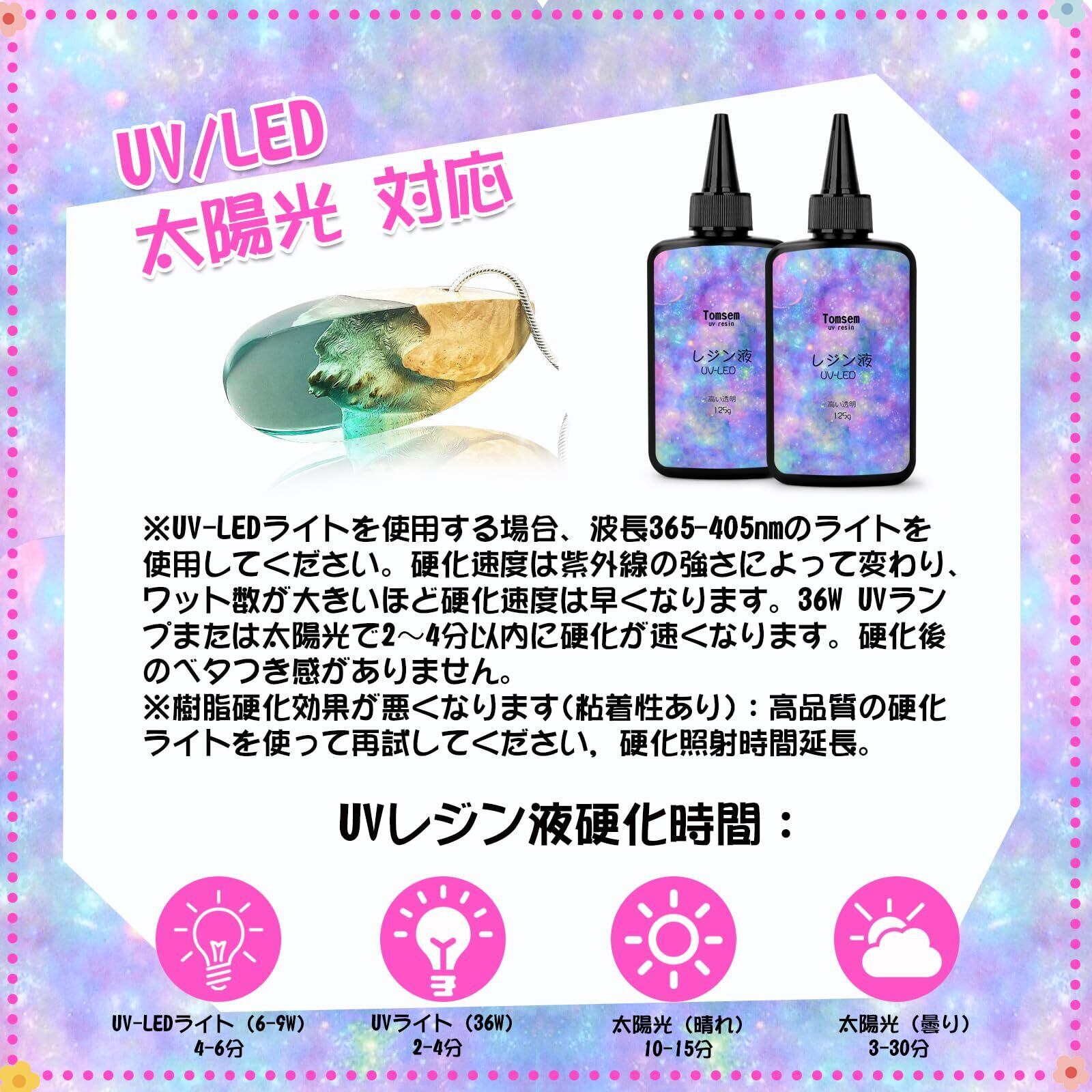 UV-LED対応と急速硬化:最新樹脂仕様、硬化時間が短い。UVレジン液は紫外線ランプやLEDランプと組み合わせて使用できます。太陽光でも簡単に液体を硬化させることができます。経験者も初心者も使いやすいです。