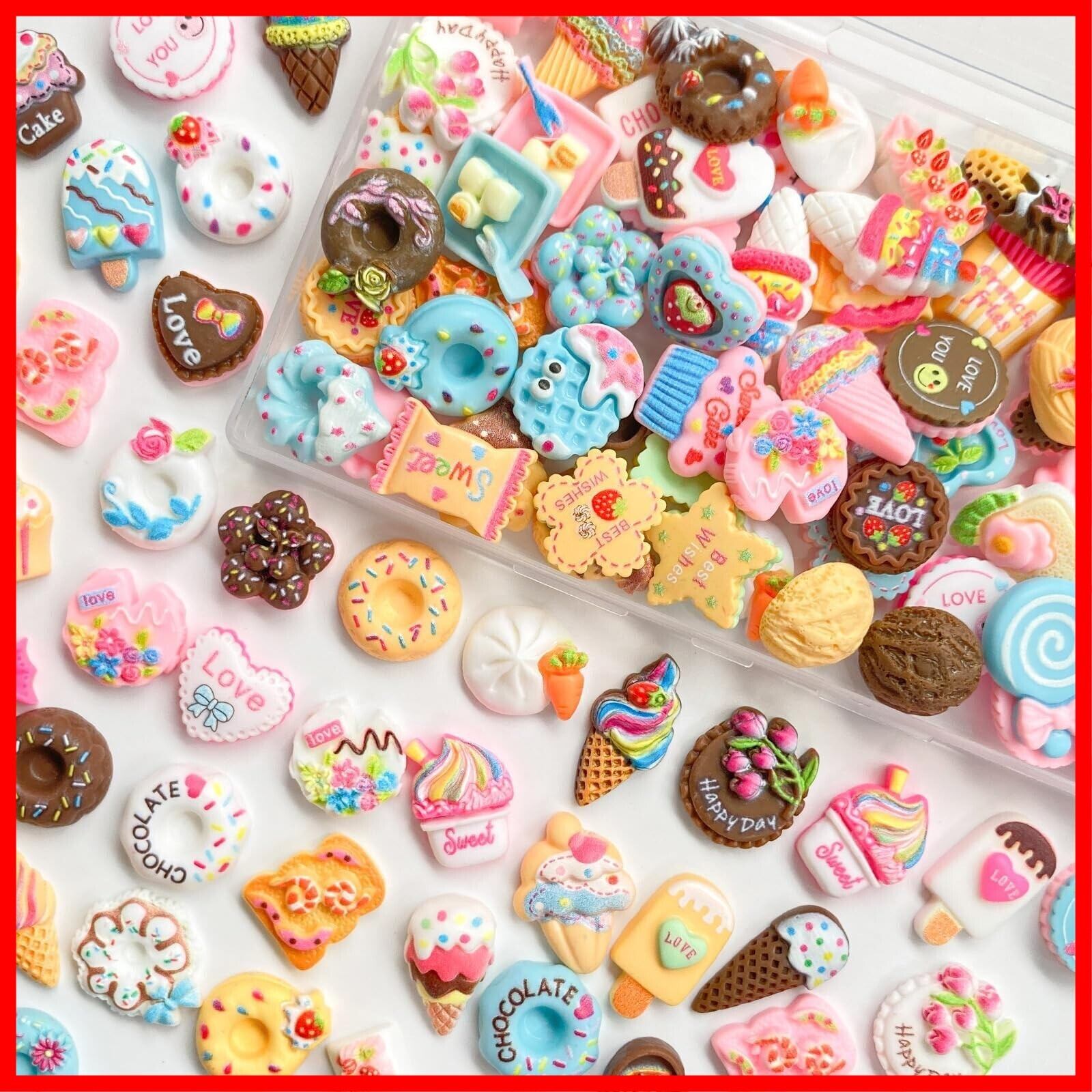 商品について➭自由に使う、デコ手芸に便利なデコパーツミックス。爪サイズから大きいサイズまで、スイーツや食べ物、お菓子などのモチーフのデコパーツの詰め合わせの福袋です。両面シールも付いているので、貼り付けデコパーツとして様々なところに貼り付けることができます。