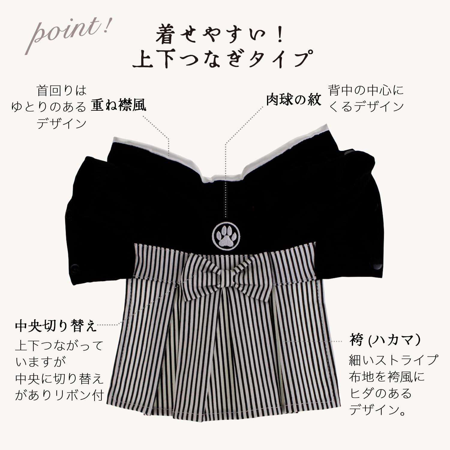 【着せやすい、上下つなぎタイプ】首回りはゆとりがあり、重ね襟風デザイン。背中の中心には肉球の紋。上下つながっているオールインワン(ワンピース)スタイル。中央に切り替えリボン付き。袴は細いストライプのハリがある布地。袴風にヒダをとったデザインです。