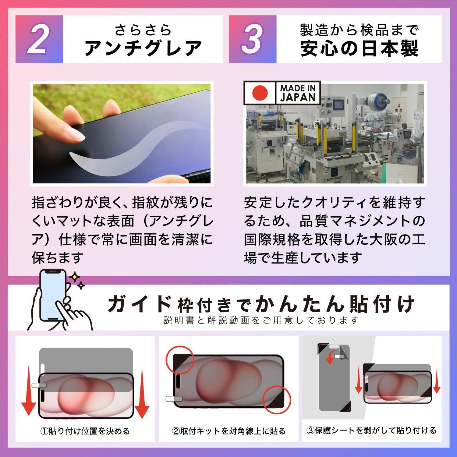【 ブルーライトカット ・ アンチグレア 】 スマホの長時間利用等の負担から目を守れるように、目に有害なブルーライトを64%、紫外線は99%までカットします。また、アンチグレア(非光沢)タイプのさらさらで快適な操作感。光の反射を軽減し、より目に優しくちらつきを抑えます。