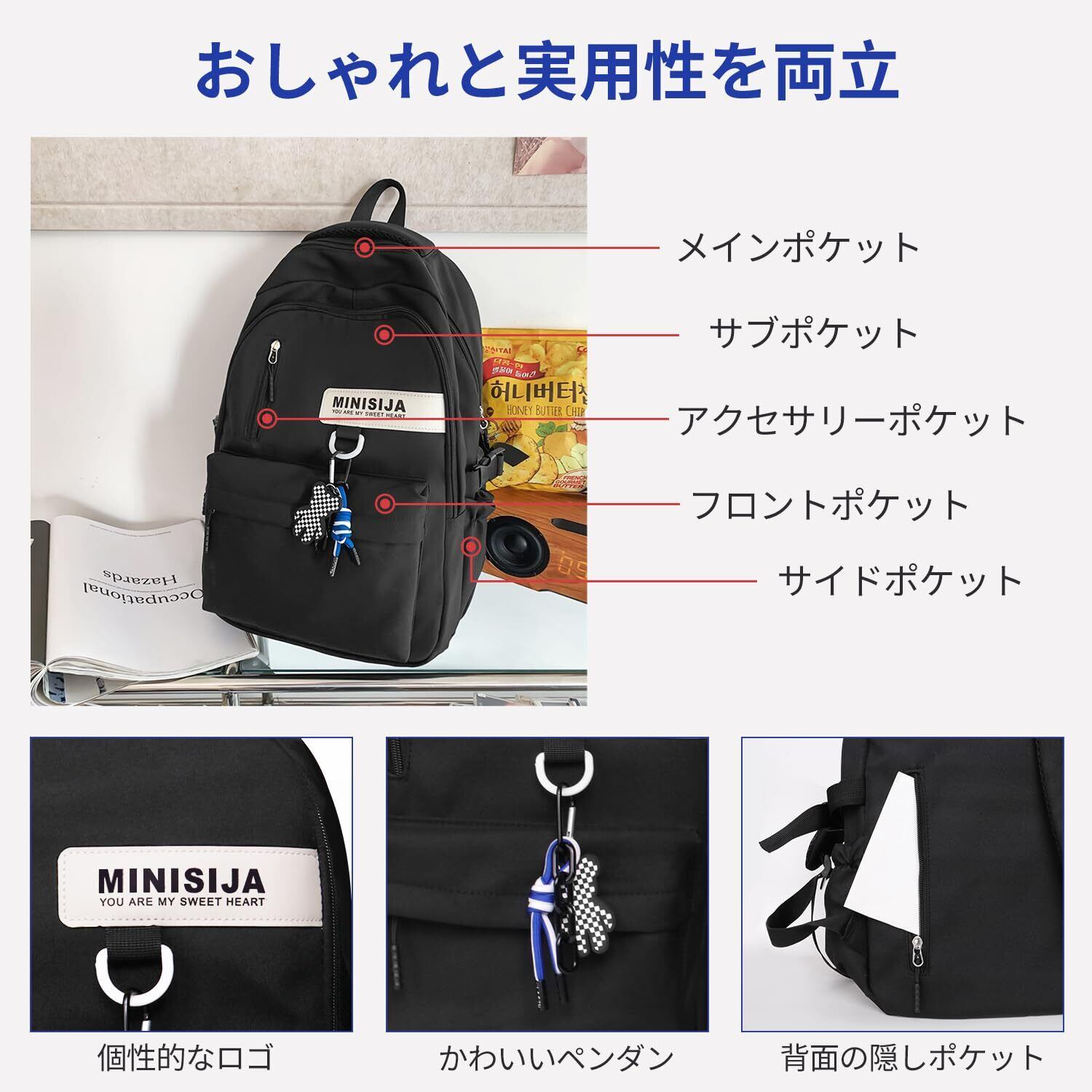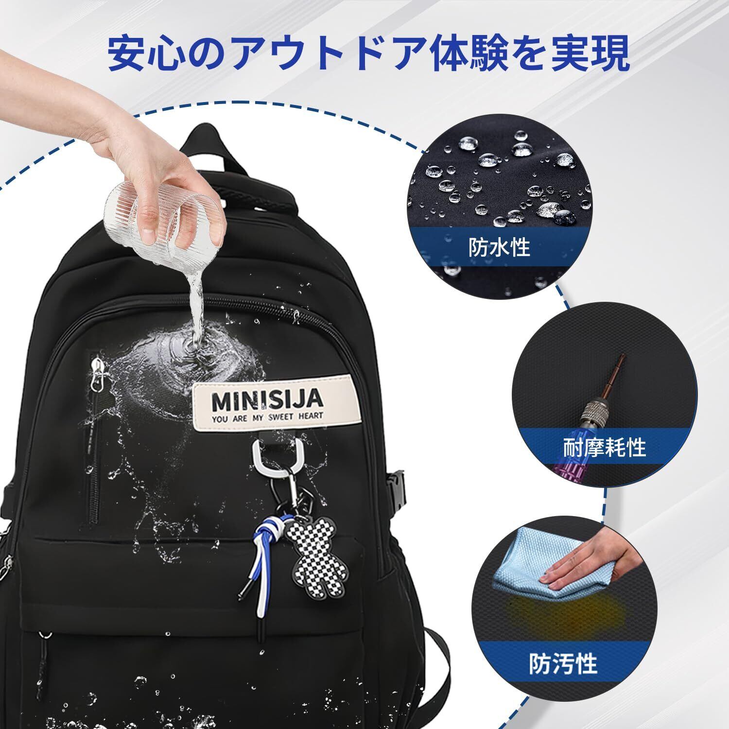【こだわりのディテール!】①厚手のダブルハンドル設計で、持ち運びがより楽で快適です。②高品質なジッパーで、スムーズに開閉でき、ストレスフリーな使用感を実現します。ゴム製の外装で操作性も向上しました。③背面には貴重品収納に便利な隠しポケットを搭載しています。 日常ギフトとしても非常におすすめです。メンズ、レディース、中学生、高校生、大学生、そして社会人まで、どなたにもぴったりな人気のリュックです。