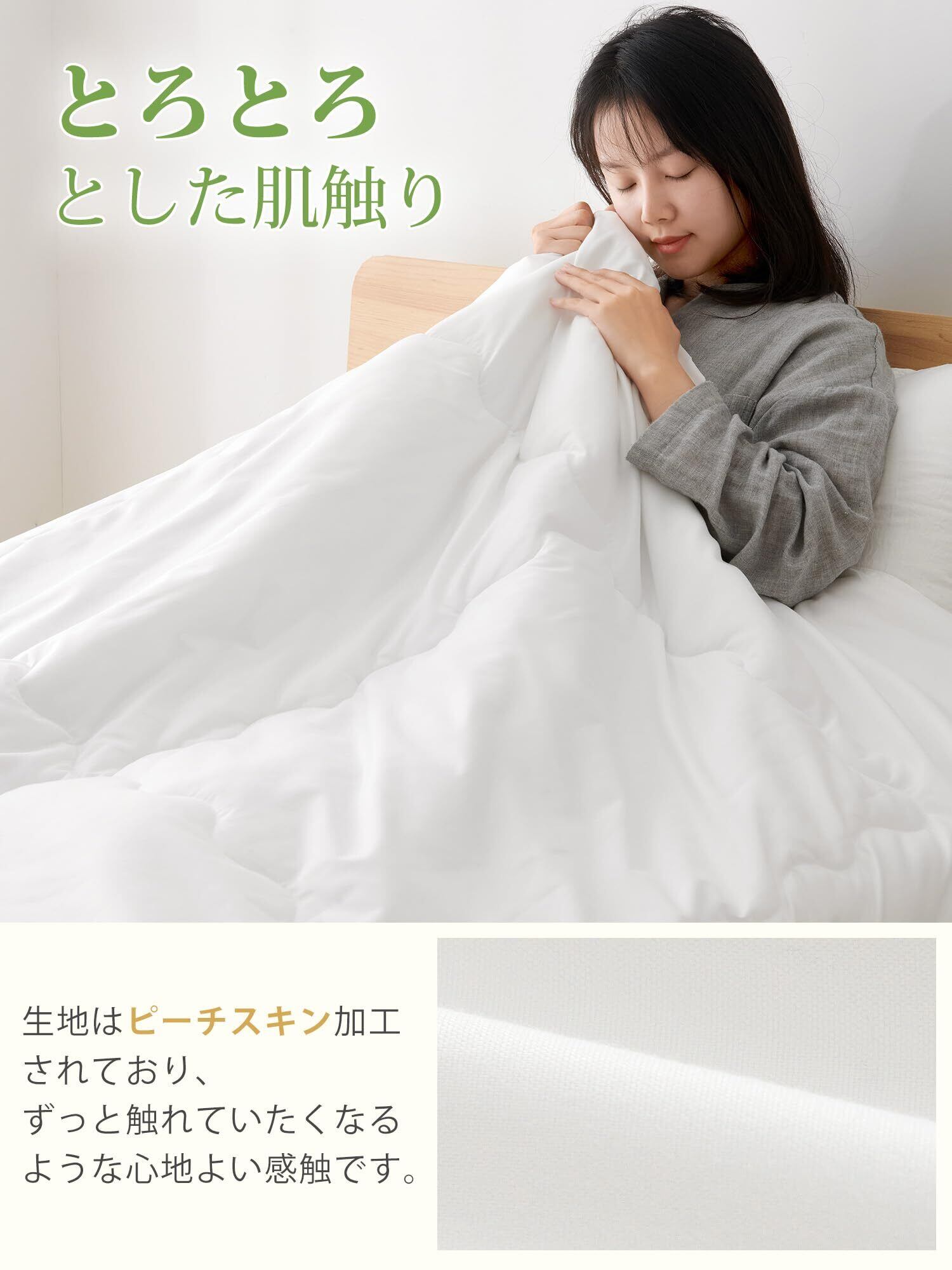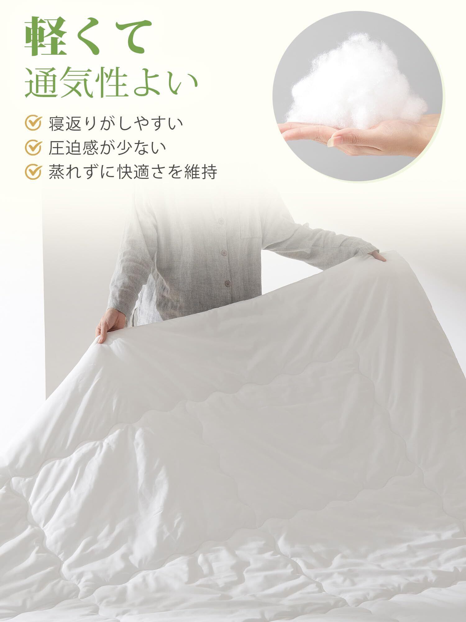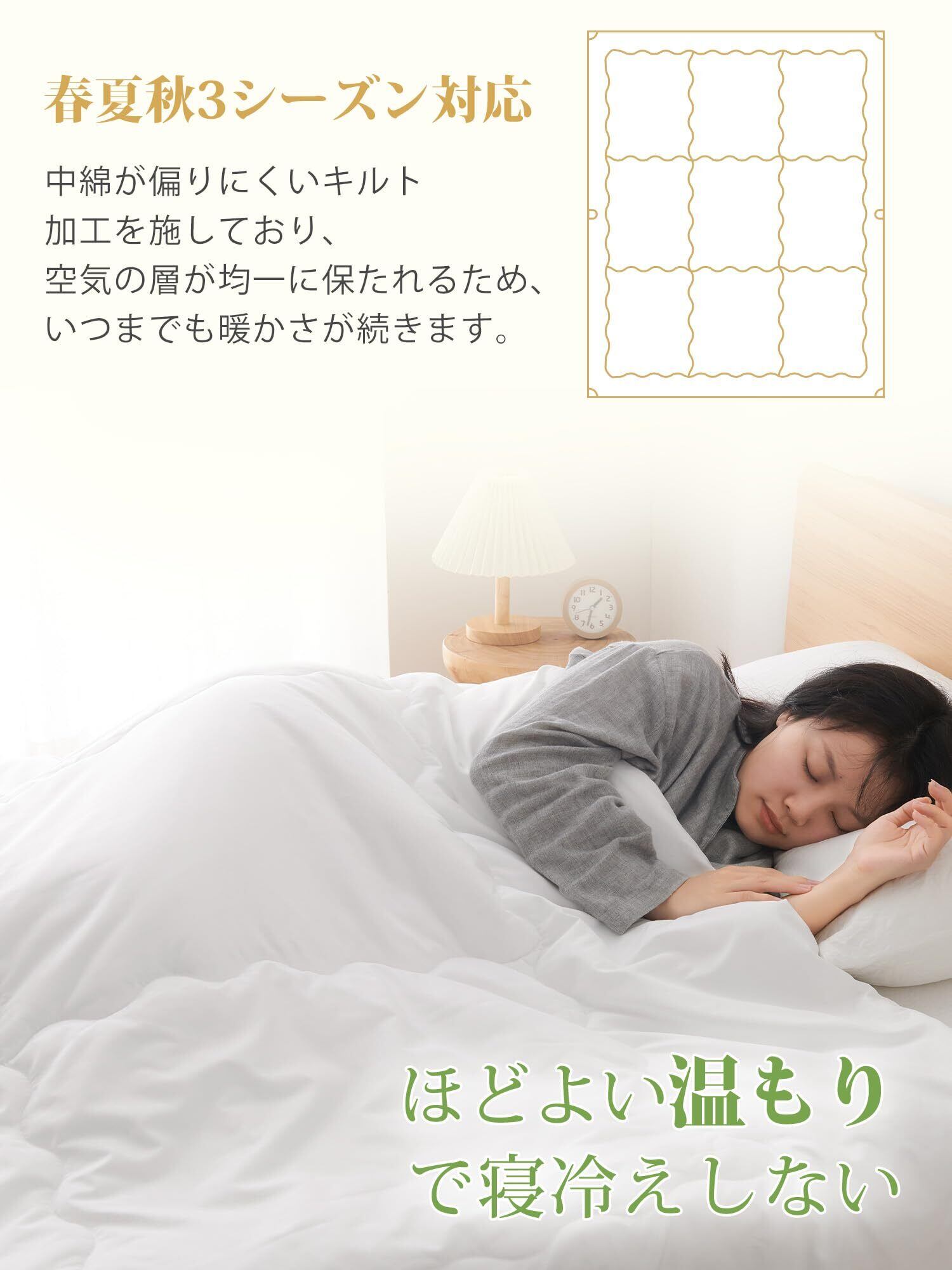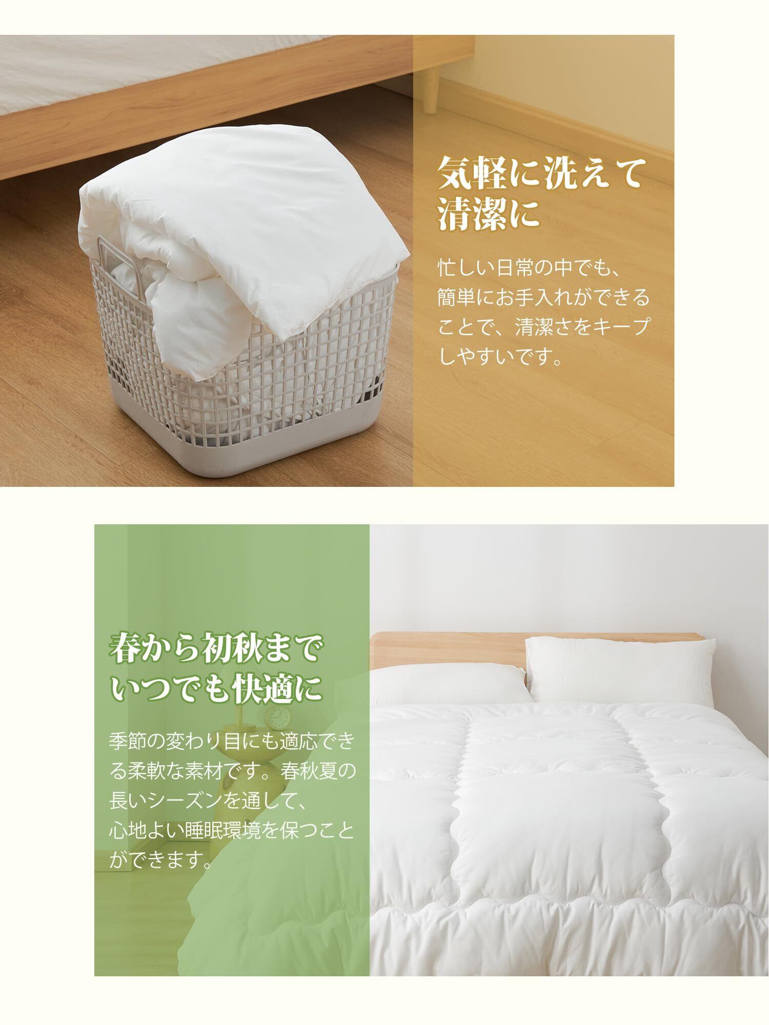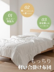 【軽くてふわふわ】わた量を通常の掛け布団の半分ほどにすることで、ふわっと軽くて体への負担を感じさせないです。適度に保温性があり、春から初秋にぴったりのアイテムです。