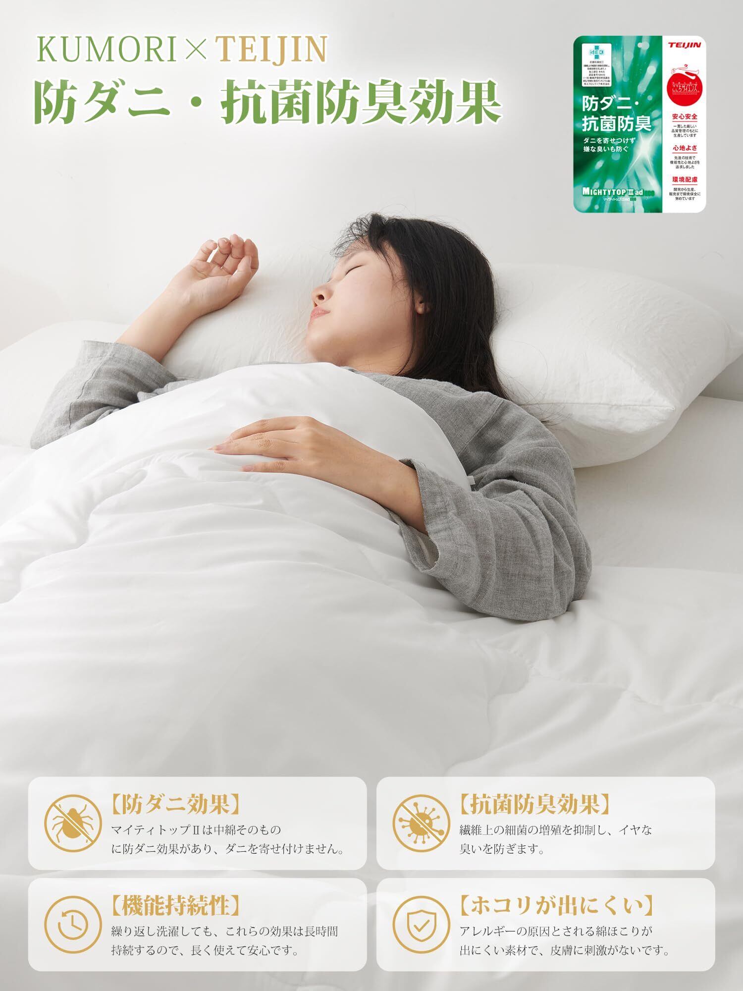 【防ダニ・抗菌防臭】中綿には防ダニ・抗菌・防臭効果のある帝人「マイティトップII」を50%使用しています。長く肌に触れる布団をいつも清潔にご使用できます。
