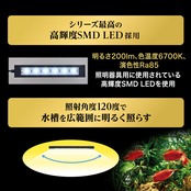 【150%の明るさ!】シリーズ最高の高輝度SMD LED採用!明るさ200lm、色温度6700K、演色性Ra85で、水槽を広範囲に照らします。生体や水草の美しさを際立たせます。