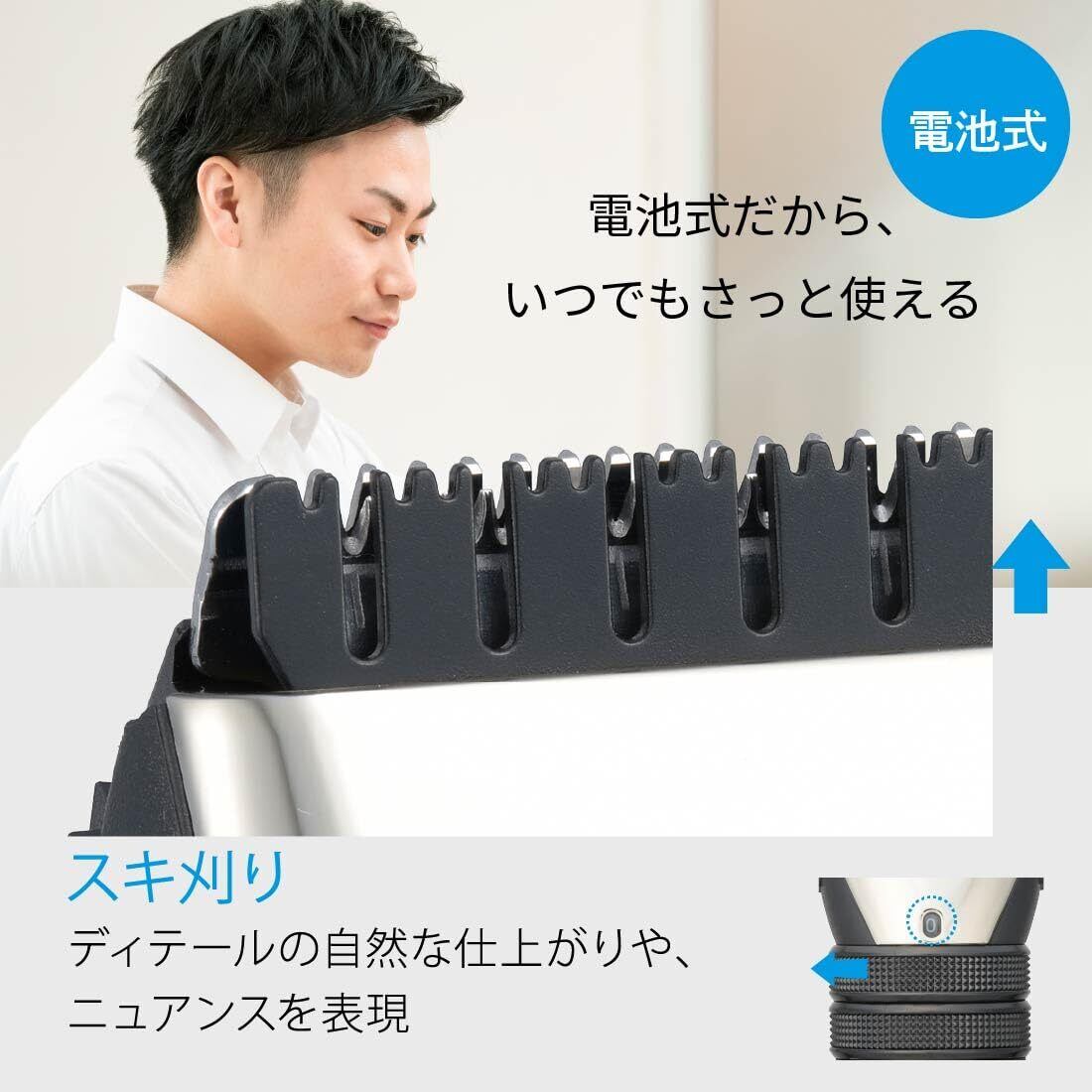 【 特 長 】 ◆電池式だから、いつでもさっと使えます ◆剃り刃は切れ味長持ちの鋭角ブレード使用 ◆5段階の刈り高調整ダイヤル付き ◆短髪用、長髪用の2種類のコーム付き ◆コームの使い分けで10段階の刈り高調整が可能 ◆スキ刈りも可能、自然な仕上がりに ◆剃り刃は取り外して水洗いOK ※本体は水洗い不可 ◆本体カラーはブラック