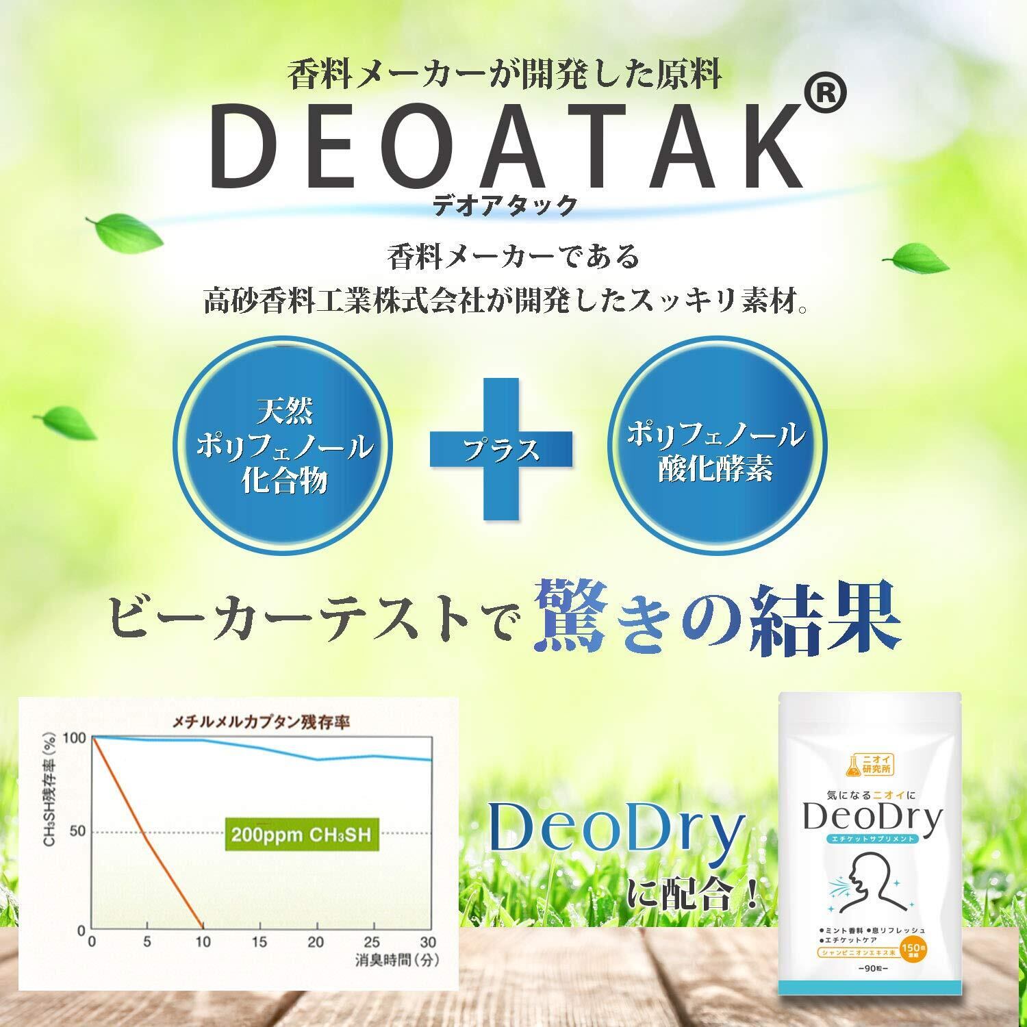 【DEOATAK、シャンピニオンエキスなど話題の成分を配合したエチケット サプリ 】 日本を代表する香料メーカーである高砂香料工業株式会社が開発したスッキリ素材DEOATAK、150倍濃縮シャンピニオンエキス、竹炭パウダーなどスッキリ成分を配合!エチケットサプリメントDeodry