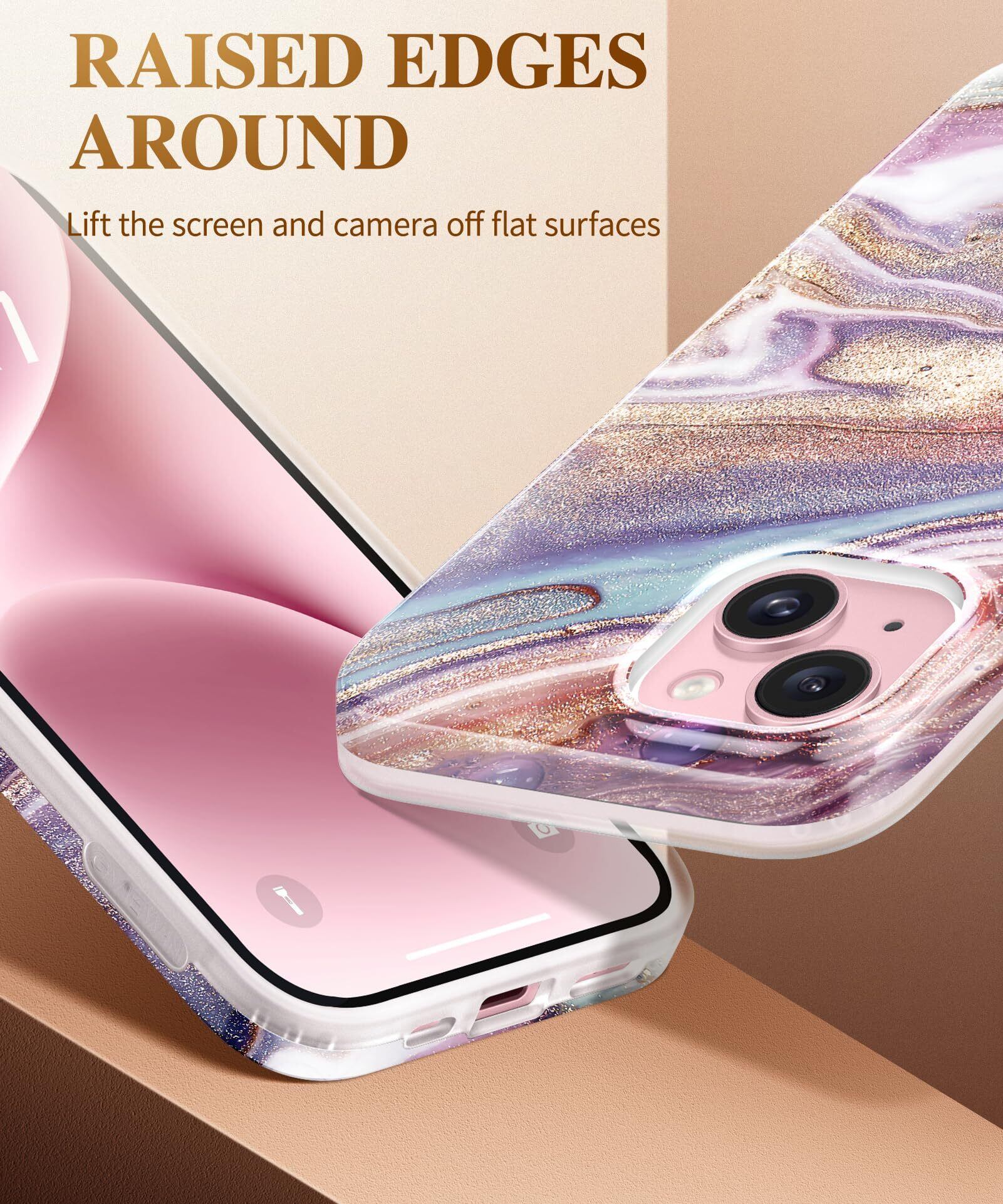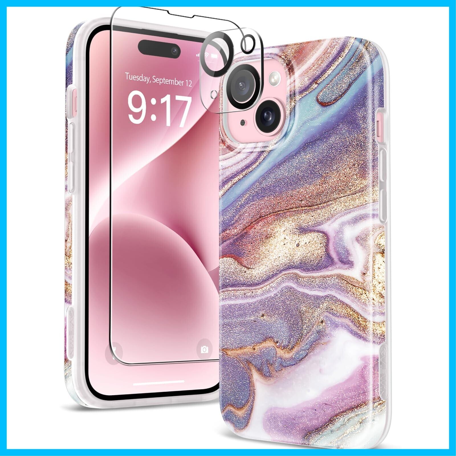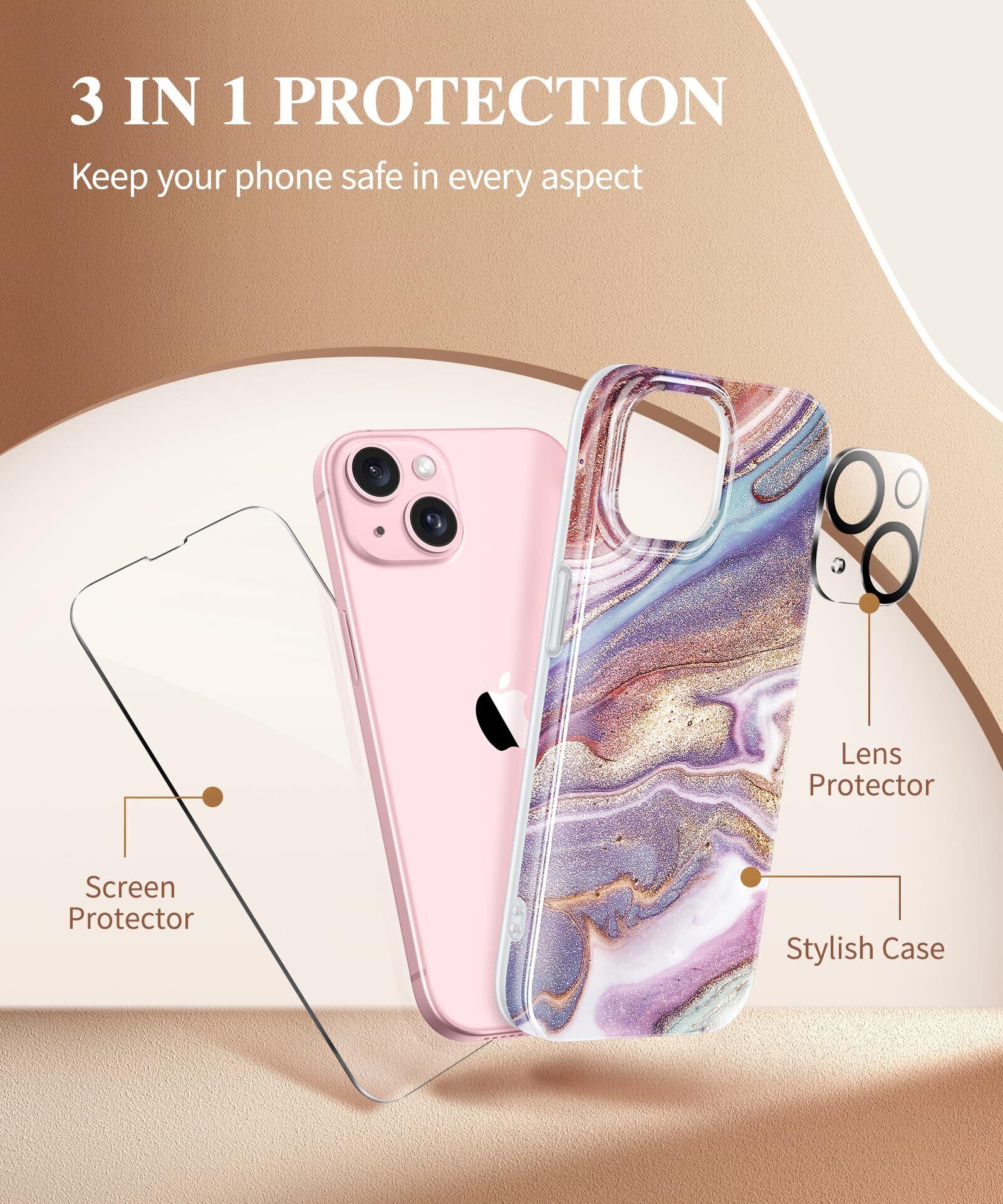 GVIEWIN 3 in 1 iPhone 15用 ケース (6.1インチ専用) 1枚フィルム+1枚カメラレンズフィルム付き 360° 全面保護 耐久性 人気 大理石柄 柔らかいTPU スリム 黄ばみ防止 薄型 米軍MIL規格耐衝撃 傷防止 充電対応 カバー アイフォン15用, ピンク