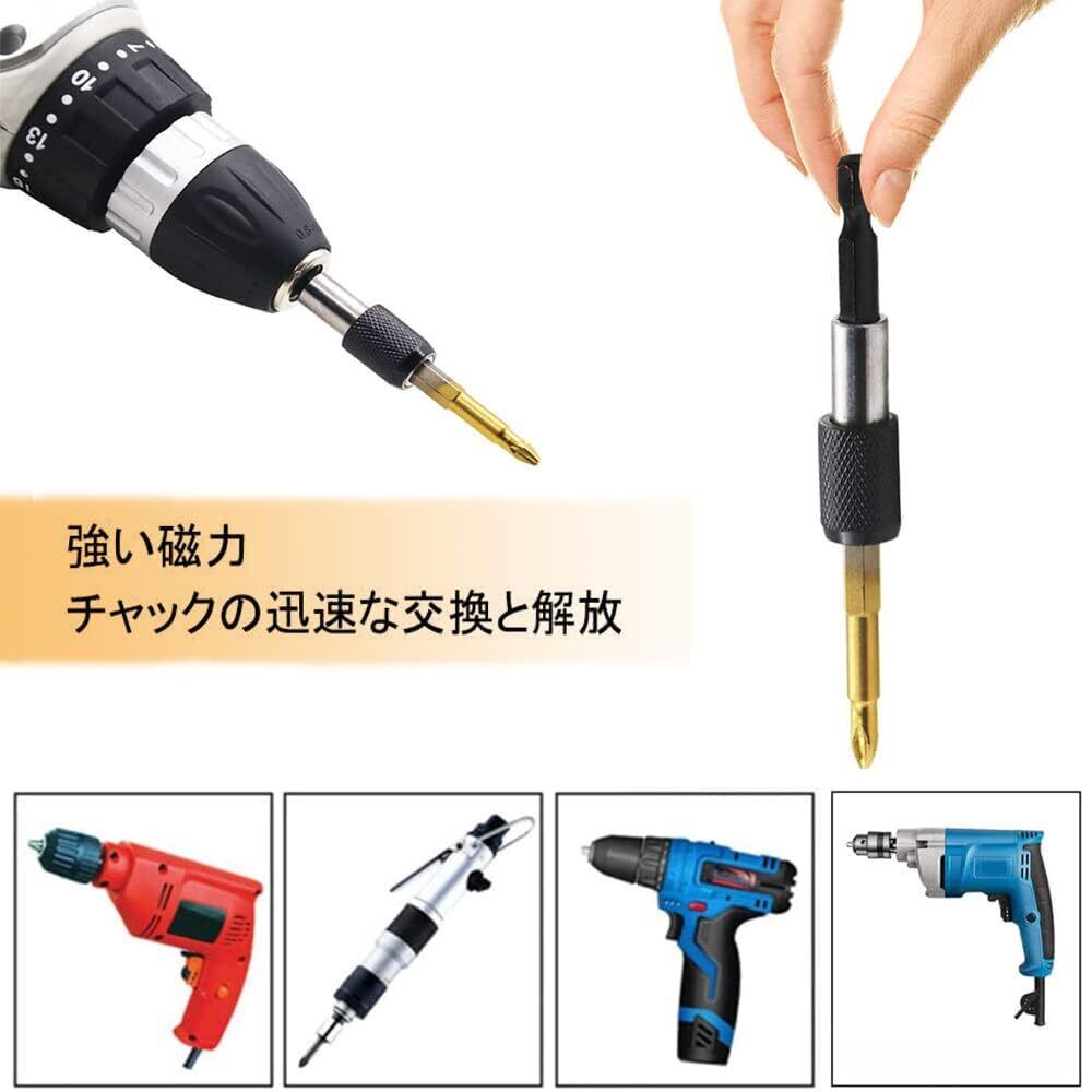 ワンタッチで装着可能な使い方簡単なデザイン:この延長ビットはワンタッチで装着可能で、使い方が簡単です。幅広くお使いいただけます。また、マグネットタイプで取り付けたビットをしっかりホールドし、内蔵が磁気、自動的にバッチの頭をポップするため、作業をよりスムーズに行えます。