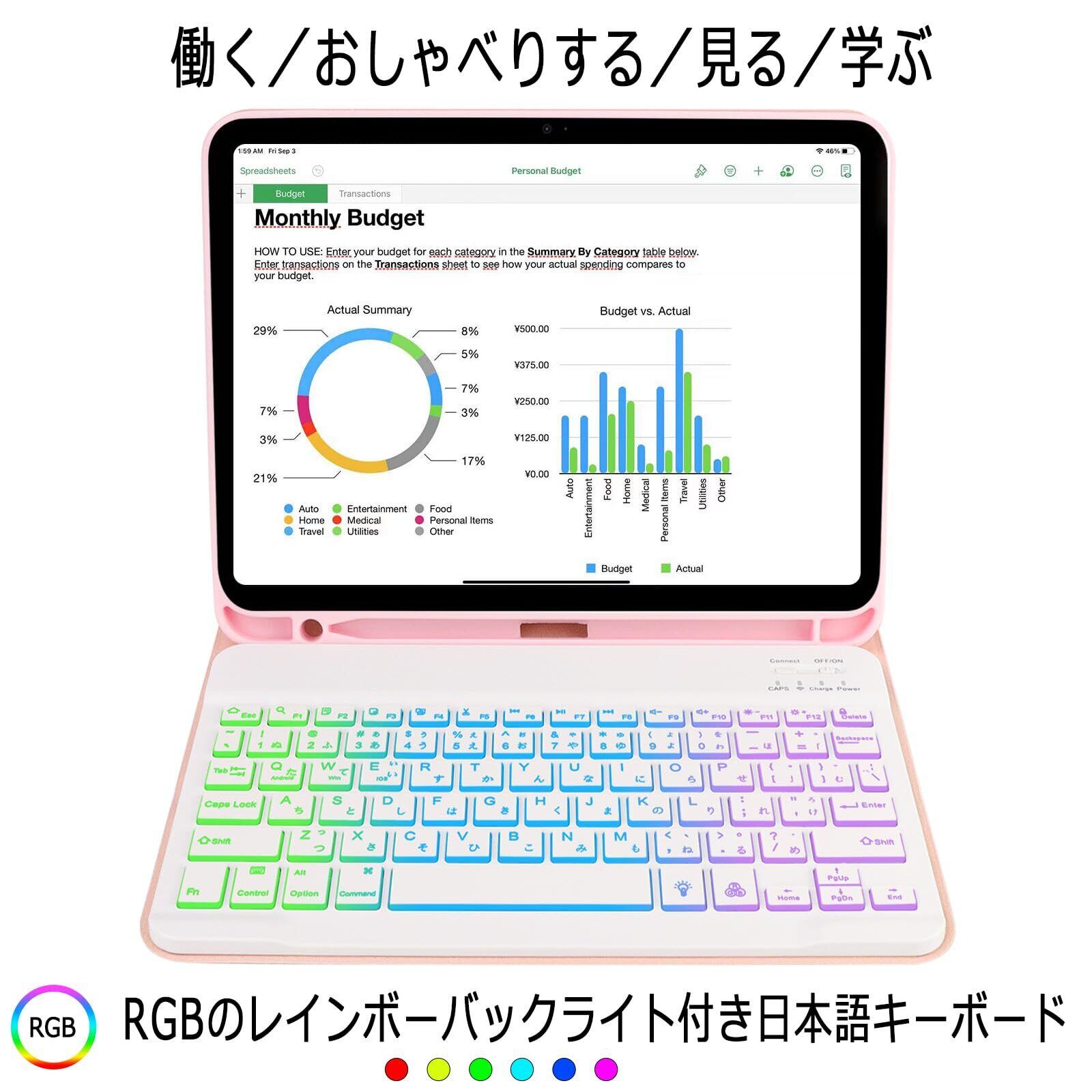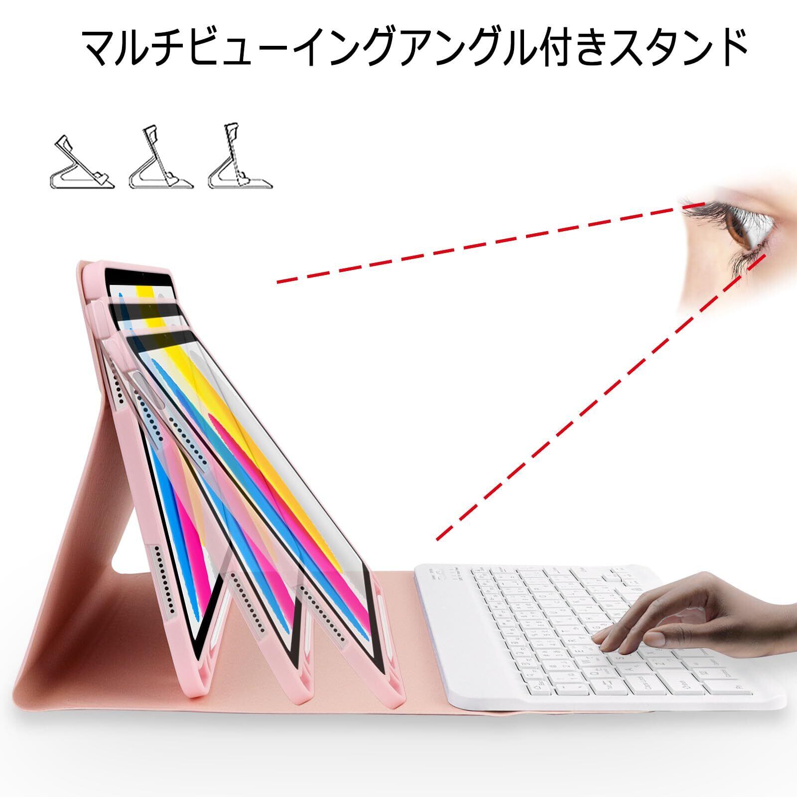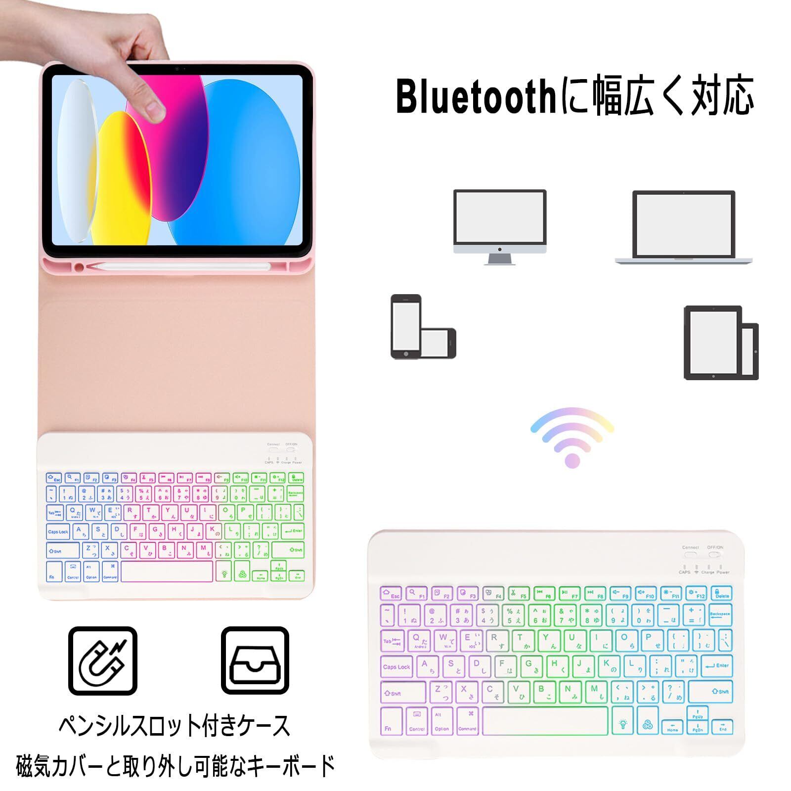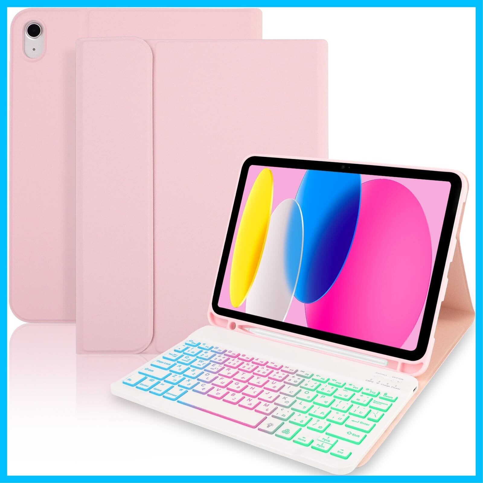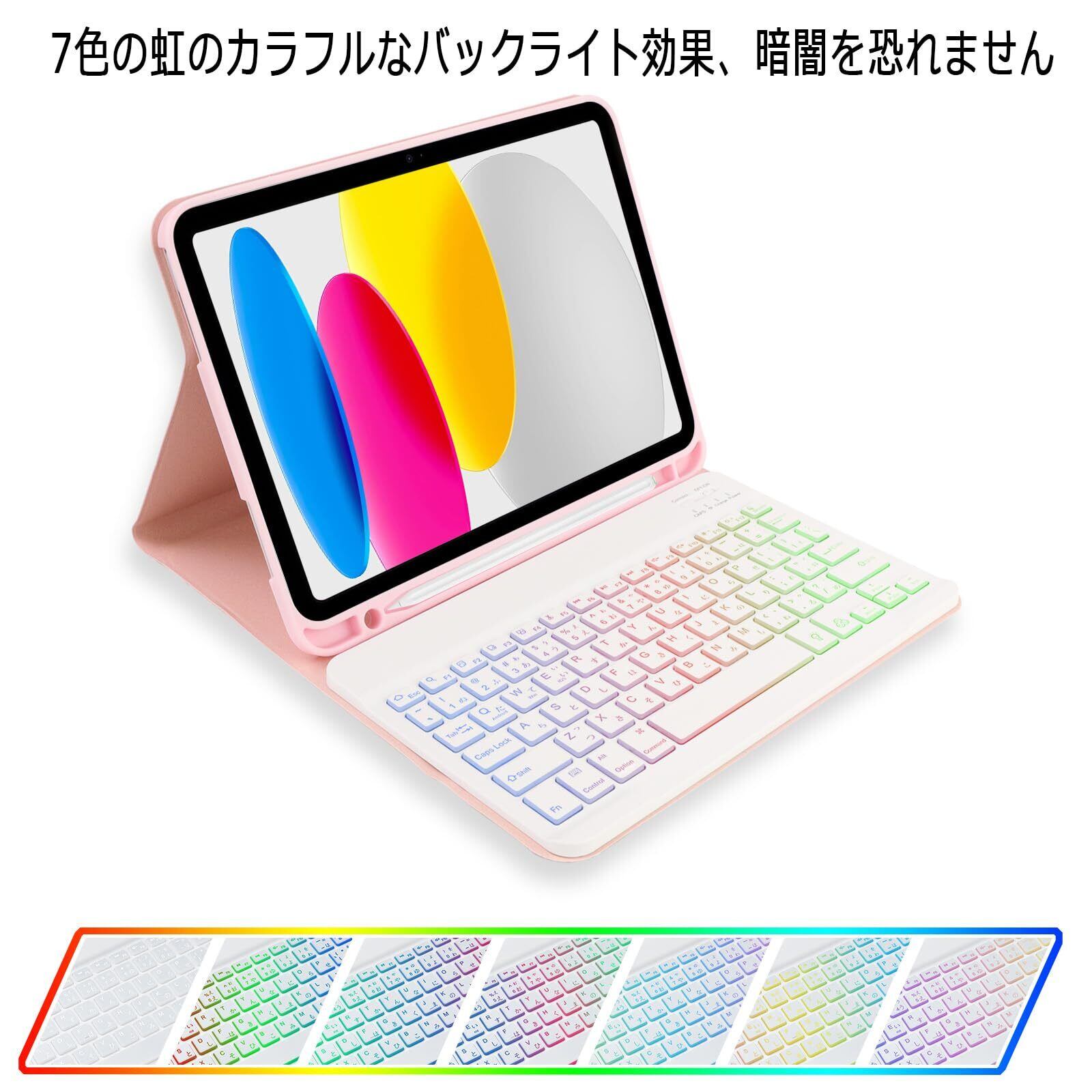 EAMPANG iPad (A16) 11インチ 第11世代2025/10世代 10.9インチ 2022ケース キーボード 日本語・英語 7色レインボーバックライトキーボード付きケース iPad 10 11世代(A2696 A2757 A2777 A3354 A3355 A3356) 脱着式 Pencil収納 スタンド機能 多角度調整 傷つけ防止 耐久性【ピンクと白】