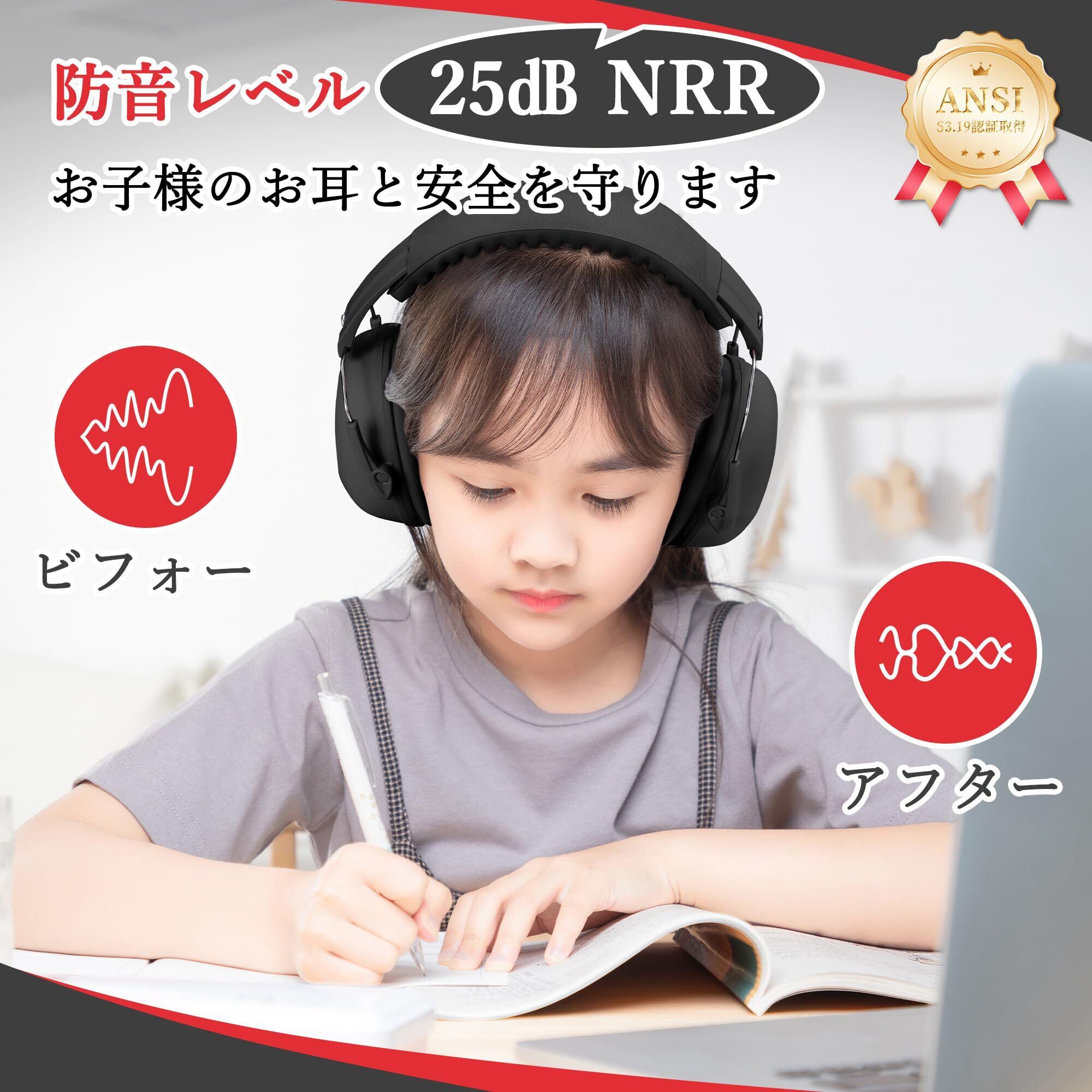 【防音値NRR 25dB】この防音イヤーマフは、周囲の雑音を軽減し、子供や聴覚過敏の方を含むさまざまな状況で使用するために高い防音性能を持っています。子供やキッズ向けの設計であり、防音イヤーマフや子供用防音イヤーマフなどとしても利用できます。米国標準規格ANSI S3.19認証による防音値のNRR25dBイヤーマフです。(完全な防音はできないことをご了承ください)