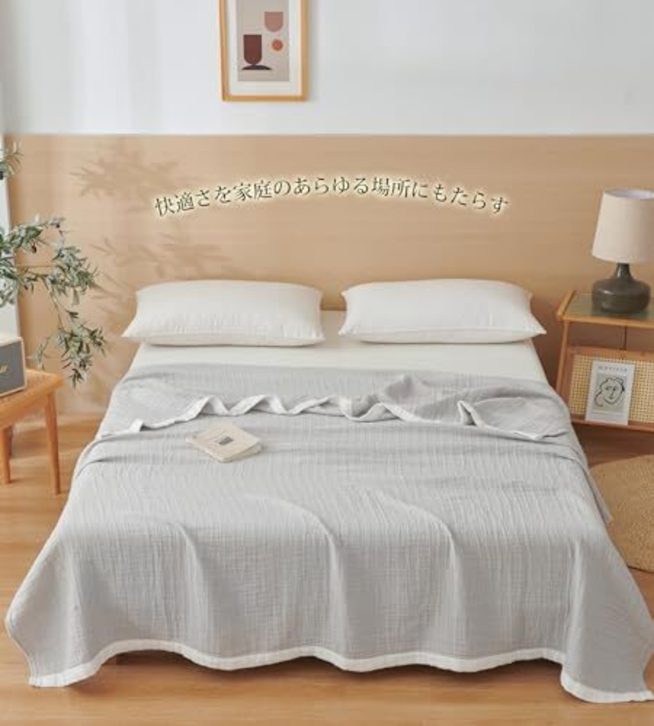 【吸湿性と通気性に優れ】ガーゼは吸湿性と速乾性に優れた綿100%を使用しており、暑い季節に汗をかいてもすぐに汗を吸収し、発散してくれるのでサラサラと快適です。 そして雨の夜。ガーゼ生地は、市販の類似品とは異なり、高密度織りを採用し、ヨコ糸の間隔を短く抑えることで、毛抜けやほつれを最小限に抑え、耐久性を向上させました。四重織りガーゼケットは肌にフィットしやすい適度な厚みで快適な寝心地を提供します。暑い夏でも蒸れにくく、サラッと快適な睡眠をお楽しみいただけます。
