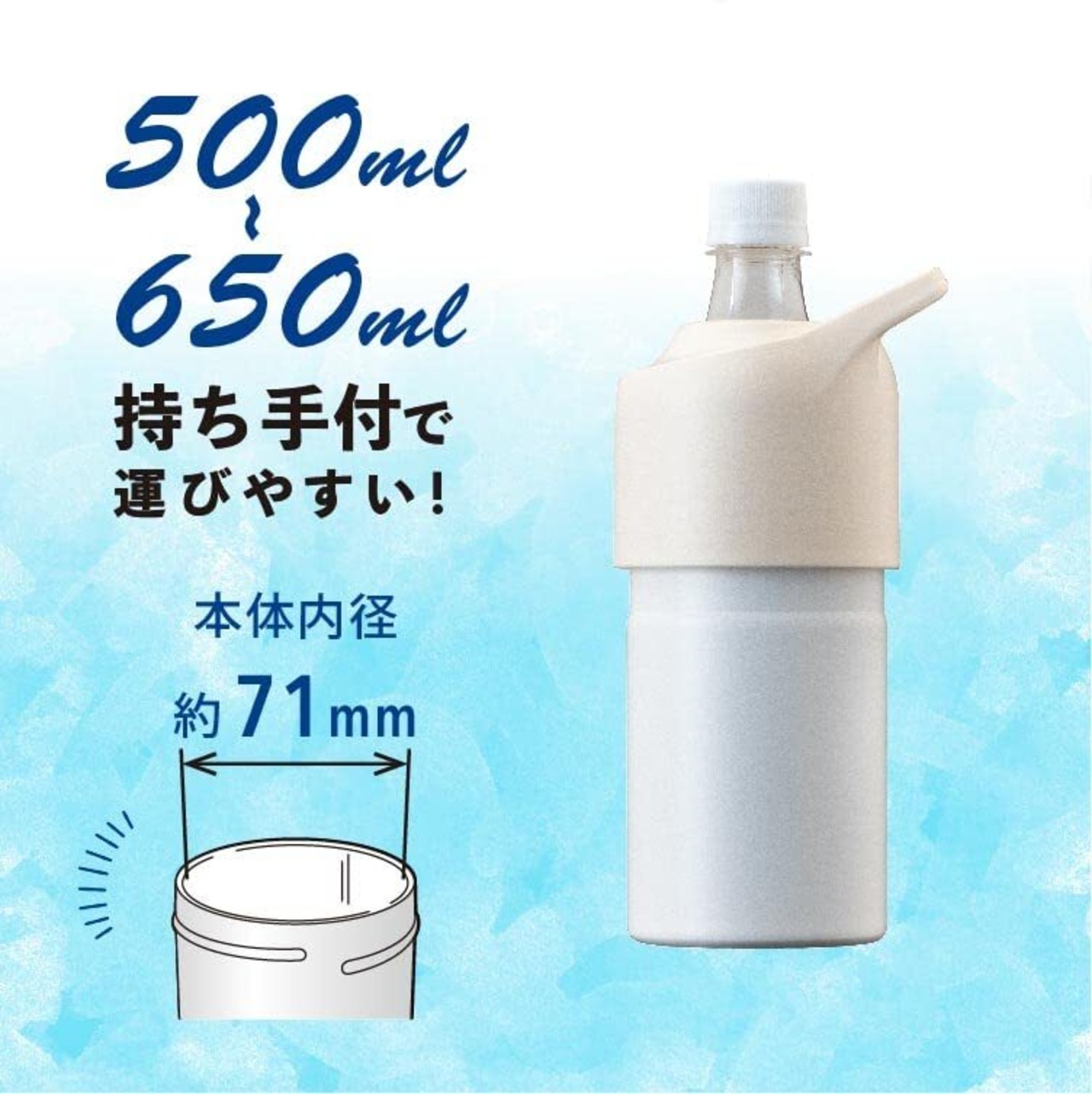 500ml〜650mlサイズのペットボトルに対応。持ち手付きで運びやすい