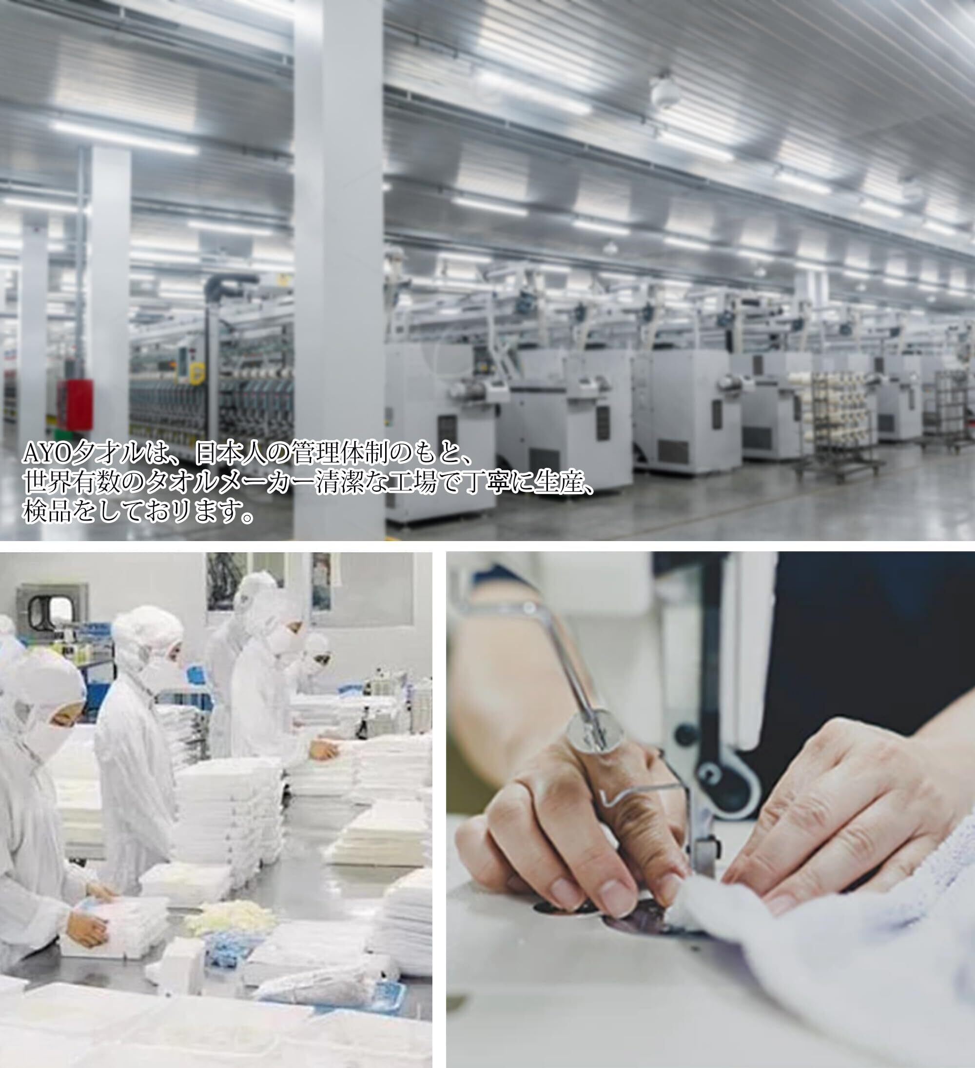 【清潔な工場 お手入れ方法】当社はお客様の立場に立って、どんなタオルが気持ちいいのか、どんなタオルが使いやすいのか、どんなタオルがお客様に満足してもらえるのかを日々研究しているメーカーです。日本のタオルメーカーが管理運営して、高品質なバスタオルやハンドタオルなどを厳選し生産しています。注意:初めて洗濯する際は、他の衣類と分けて洗うことをお勧めします。色移りの可能性がございます。洗濯の際は塩素系漂白剤を使用しないでください。変色や素材劣化の原因となります。毛羽がほつれた場合は引っ張らずにハサミで毛羽の部分と同じ長さにカットしてください。