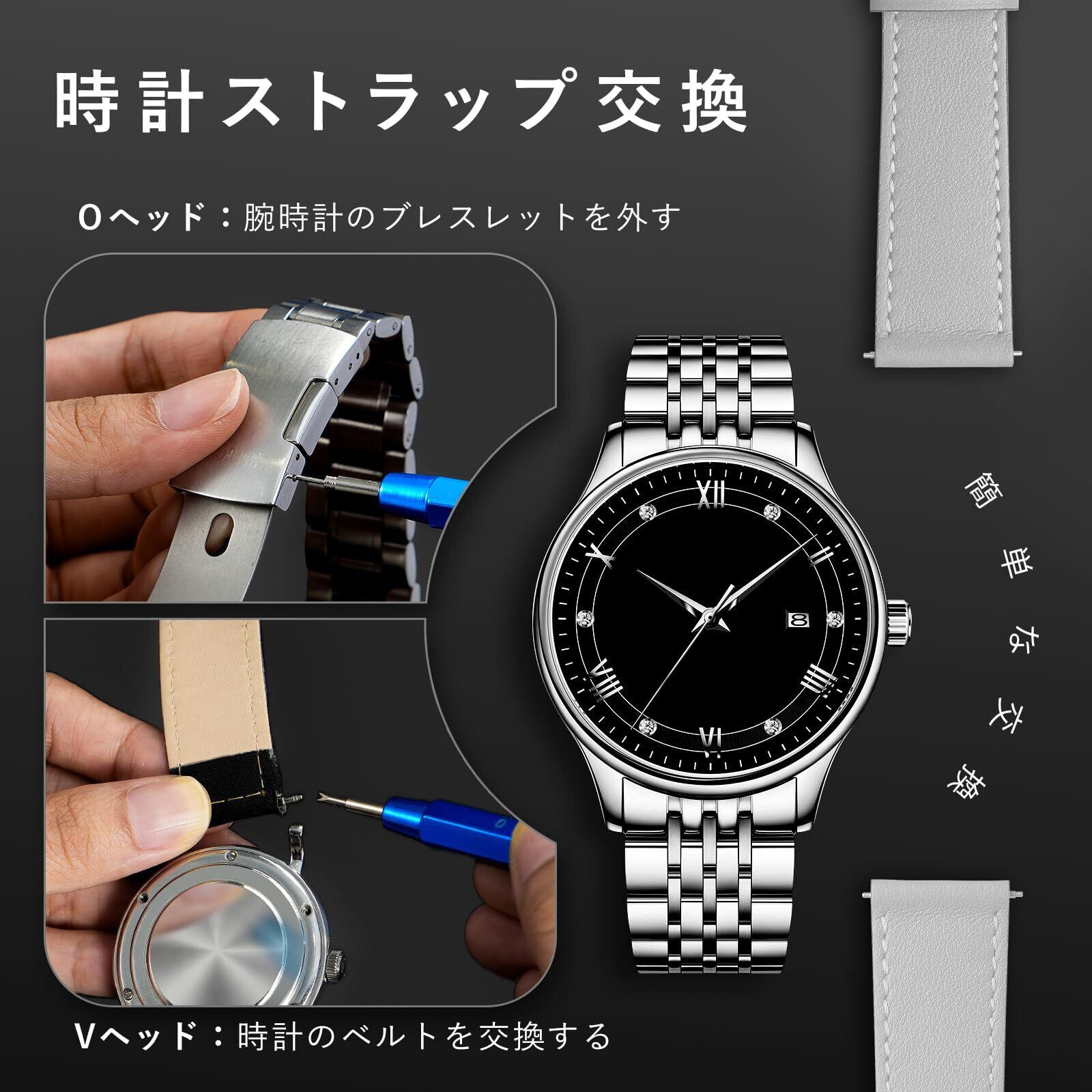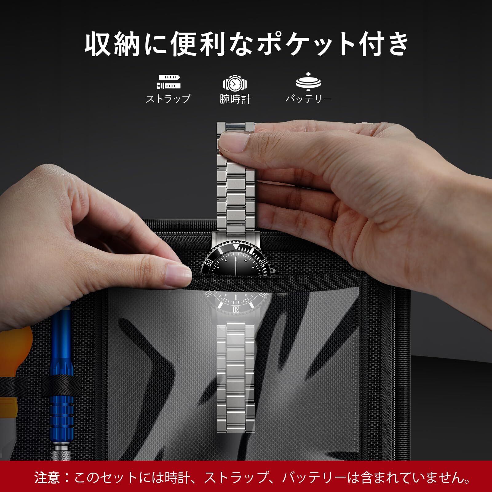 【収納と持ち運びが簡単】①このファスナーポーチは、すべての修理工具を収納できるだけでなく、透明なストラップが内蔵されており、取扱説明書や予備バッテリー、予備ストラップなどを収納することができます。②注)ポーチは収納可能なもののみで、時計、ストラップ、電池はセットされていません。③持ち運びに便利なヒモ付き。