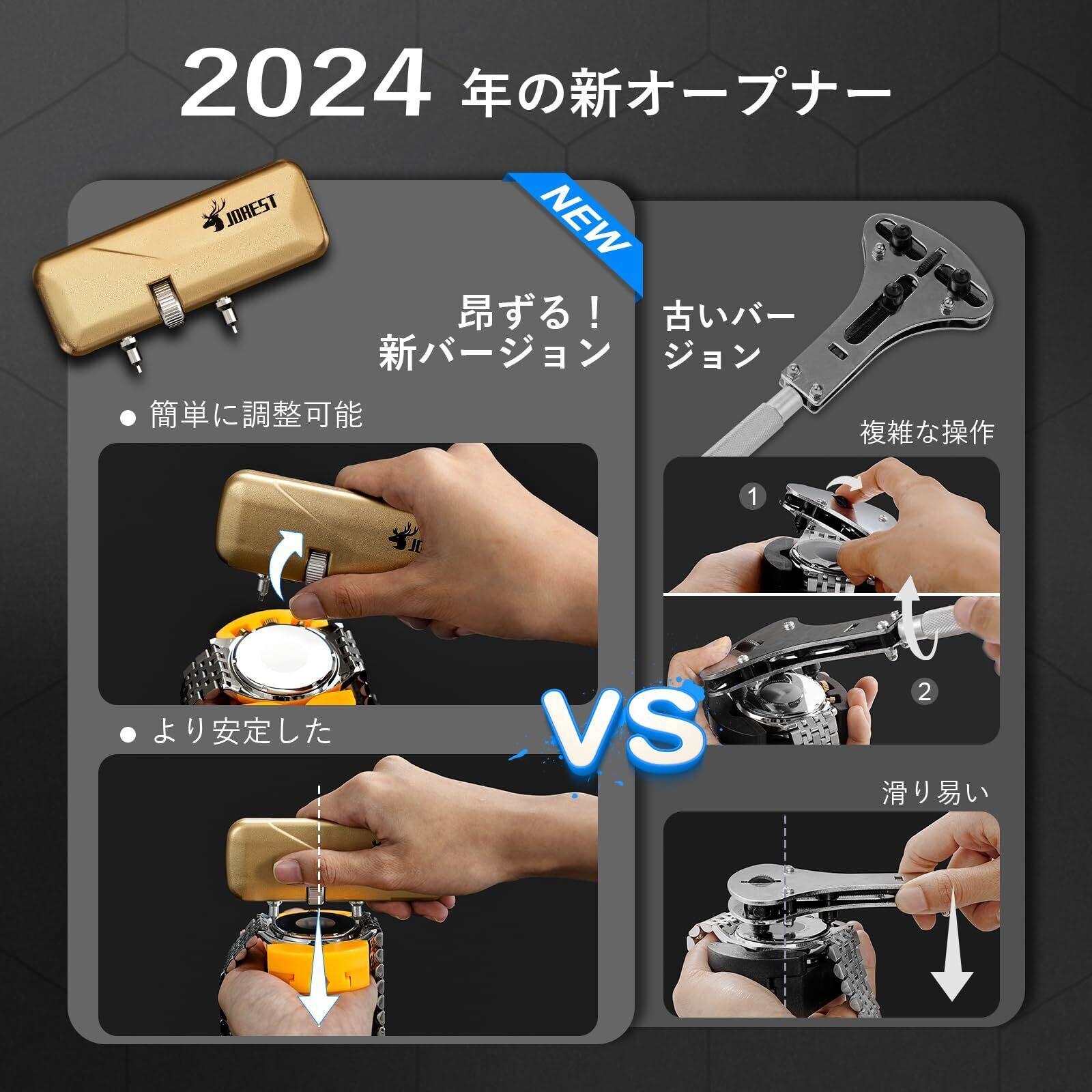 【2024 ニュー・キャップス・オープナー&ウォッチ・デプレッサー】①アップグレードされた回転式ウォッチ・オープナーは、より安定し、サイズが大きくなり、より快適に握れるようになりました。②新しいウォッチ・プレッサーは、より安定し、より正確で、手間がかかりません。