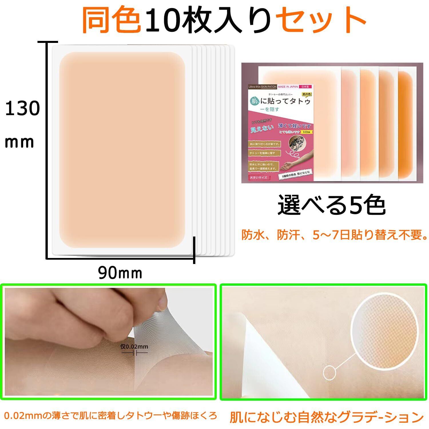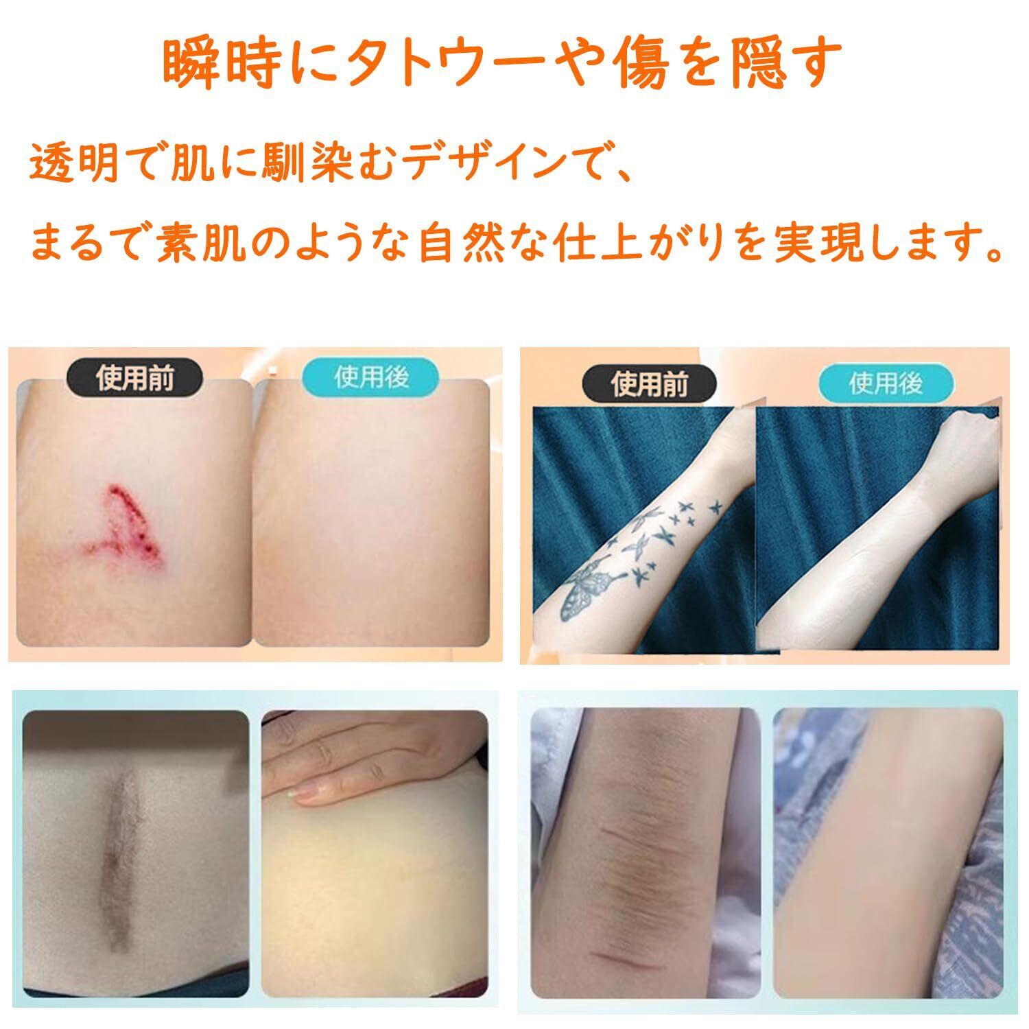 【使用場所】温泉やプール、レジャー、ジム、パーティー、旅行などタトゥーやあざ、ほくろ、傷あとを簡単に隠せます。5~7日貼り替え不要。防水、防汗、傷防止、しわ防止、剥がれ防止などの機能があります。