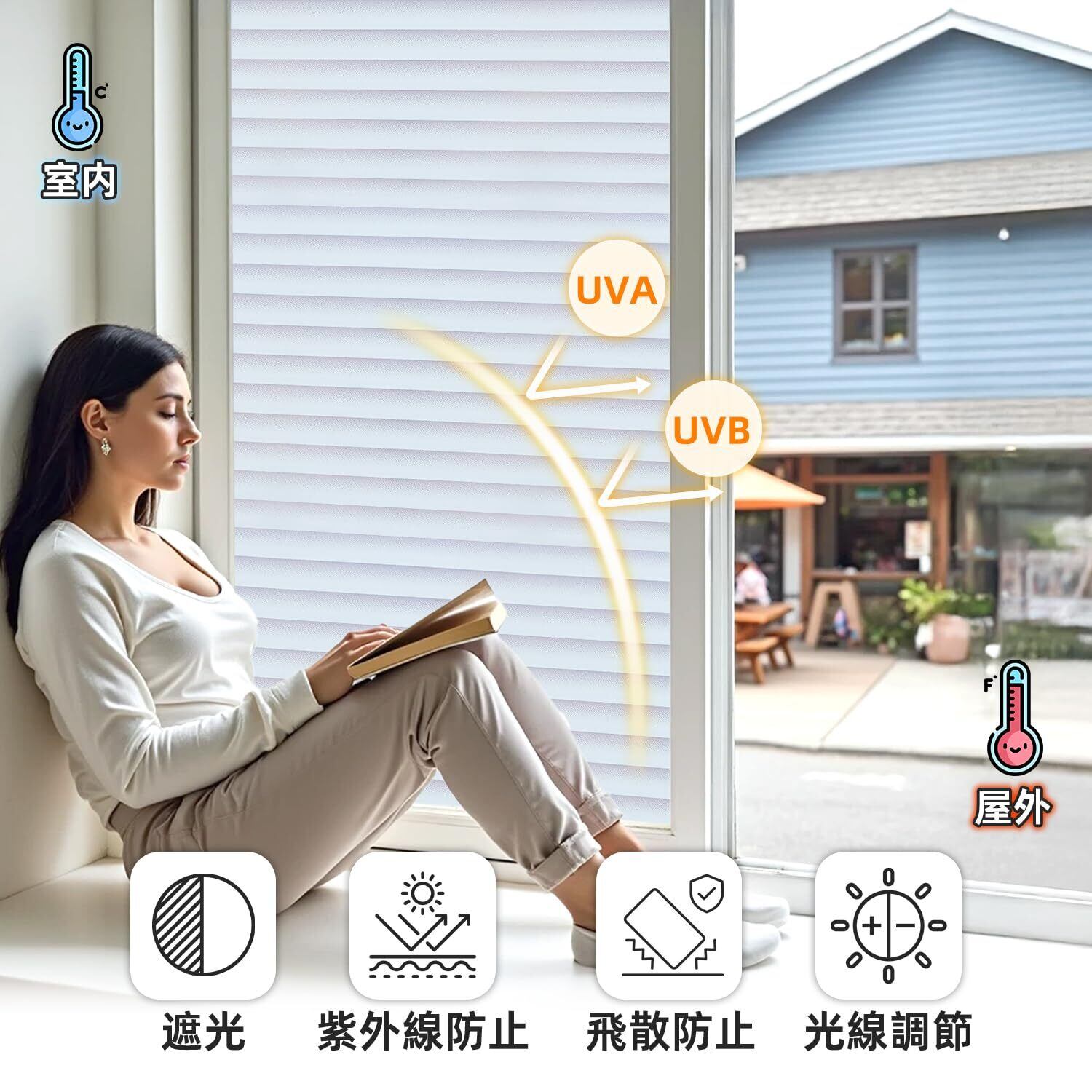 空間美感をアップ、エレガントなビジュアル効果: 窓ガラス目隠しフィルムは、クラシックなブラインドデザインにインスパイアされ、洗練されたモダンな外観を作り出します。このフィルムは、シンプルでありながらエレガントなビジュアル効果を演出し、どんな空間にもファッション性と上品さを加えます。また、太陽光を柔らかく拡散させ、紫外線を効果的に遮断することで、居住空間やオフィス環境に快適さと保護を提供します。重くなく、時代遅れに見えることなく、現代的なスタイルを引き立てます。