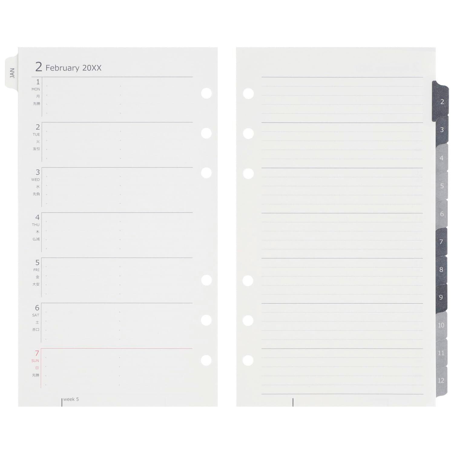 【本文】126P(12ヶ月分) 【用紙】マルマン筆記用紙 90g/m2 【穴数】6穴