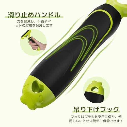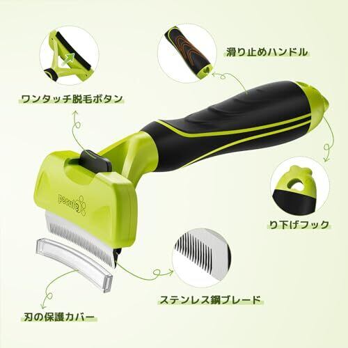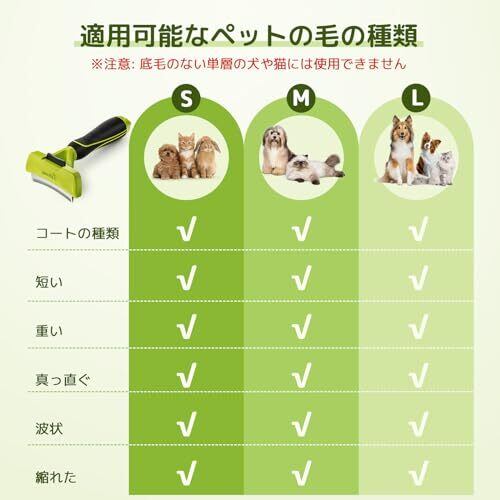 【安全で丈夫な素材】ペットブラシ本体はABSとTPRの環境に優しい素材を採用しており、安心してご使用いただけます。 304ステンレス鋼の刃、錆びず、長期間使用できます。 また、独自の刃の設計により、使用中にペットの皮膚を傷つけません。※ 但し、ワンちゃんの背中をブラッシングする際、刃が背骨にあたると痛いので優しく、ゆっくりとブラッシングしてください。