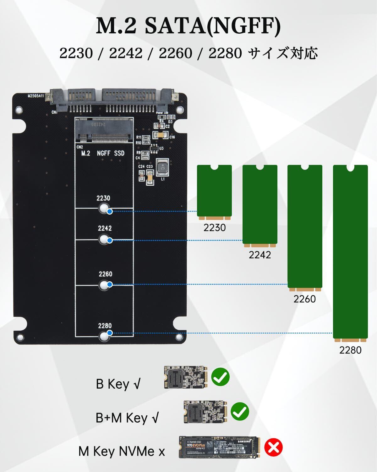 【NGFF to SATA アダプタ】NGFF SSDを2.5インチのハードディスクに変換し、2230/2242/2260/2280mmサイズのM.2 ハードディスクを対応しています。B key、とB+M keyに対応しています。※ご注意:NGFFのみ対応します。NVMEは対応しません※