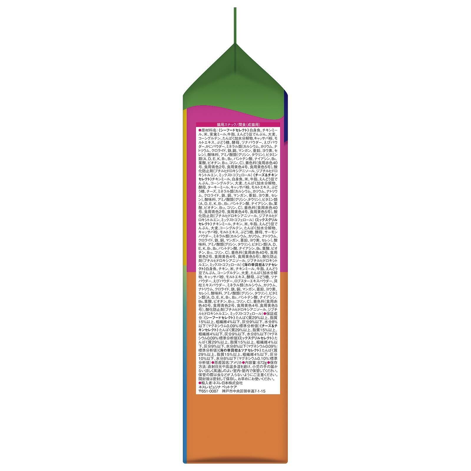 原材料:<シーフードセレクト> 白身魚、チキンミール、米、家禽ミール、牛脂、えんどう豆でんぷん、大麦、コーングルテン、たんぱく加水分解物、キャッサバ粉、モルトエキス、ぶどう糖、酵母、ツナパウダー、えびパウダー、かにパウダー、ミネラル類(カルシウム、カリウム、ナトリウム、クロライド、鉄、銅、マンガン、亜鉛、ヨウ素、セレン)、酸味料、アミノ酸類(グリシン、タウリン)、ビタミン類(A、D、E、K、B1、B2、パントテン酸、ナイアシン、B6、葉酸、ビオチン、B12、コリン、C)、着色料(食用赤色40号、食用青色2号、食用黄色4号、食用黄色5号)、酸化防止剤(ブチルヒドロキシアニソール、ジブチルヒドロキシトルエン、ミックストコフェロール) <チーズ&チキンセレクト> チキンミール、白身魚、米、牛脂、えんどう豆でんぷん、コーングルテン、大麦、たんぱく加水分解物、酵母、ターキーミール、キャッサバ粉、モルトエキス、ぶどう糖、チーズ、ミネラル類(カルシウム、カリウム、ナトリウム、クロライド、鉄、銅、マンガン、亜鉛、ヨウ素、セレン)、酸味料、アミノ酸類(グリシン、タウリン)、ビタミン類(A、D、E、K、B1、B2、パントテン酸、ナイアシン、B6、葉酸、ビオチン、B12、コリン、C)、着色料(食用赤色40号、食用青色2号、食用黄色4号、食用黄色5号)、酸化防止剤(ブチルヒドロキシアニソール、ジブチルヒドロキシトルエン、ミックストコフェロール) <ミックスグリルセレクト> チキンミール、チキン、米、牛脂、えんどう豆でんぷん、大麦、コーングルテン、たんぱく加水分解物、キャッサバ粉、モルトエキス、ぶどう糖、酵母、サーモンパウダー、ミネラル類(カルシウム、カリウム、ナトリウム、クロライド、鉄、銅、マンガン、亜鉛、ヨウ素、セレン)、酸味料、アミノ酸類(グリシン、タウリン)、ビタミン類(A、D、E、K、B1、B2、パントテン酸、ナイアシン、B6、葉酸、ビオチン、B12、コリン、C)、着色料(食用赤色40号、食用青色2号、食用黄色4号、食用黄色5号)、酸化防止剤(ブチルヒドロキシアニソール、ジブチルヒドロキシトルエン、ミックストコフェロール) <海の幸 貝柱&ツナセレクト> 白身魚、チキン、米、チキンミール、牛脂、えんどう豆でんぷん、コーングルテン、大麦、たんぱく加水分解物、キャッサバ粉、モルトエキス、酵母、ぶどう糖、ツナパウダー、えびパウダー、ロブスターエキスパウダー、貝柱エキスパウダー、ミネラル類(カルシウム、カリウム、ナトリウム、クロライド、鉄、銅、マンガン、亜鉛、ヨウ素、セレン)、酸味料、アミノ酸類(グリシン、タウリン)、ビタミン類(A、D、E、K、B1、B2、パントテン酸、ナイアシン、B6、葉酸、ビオチン、B12、コリン、C)、着色料(食用赤色40号、食用青色2号、食用黄色4号、食用黄色5号)、酸化防止剤(ブチルヒドロキシアニソール、ジブチルヒドロキシトルエン、ミックストコフェロール)