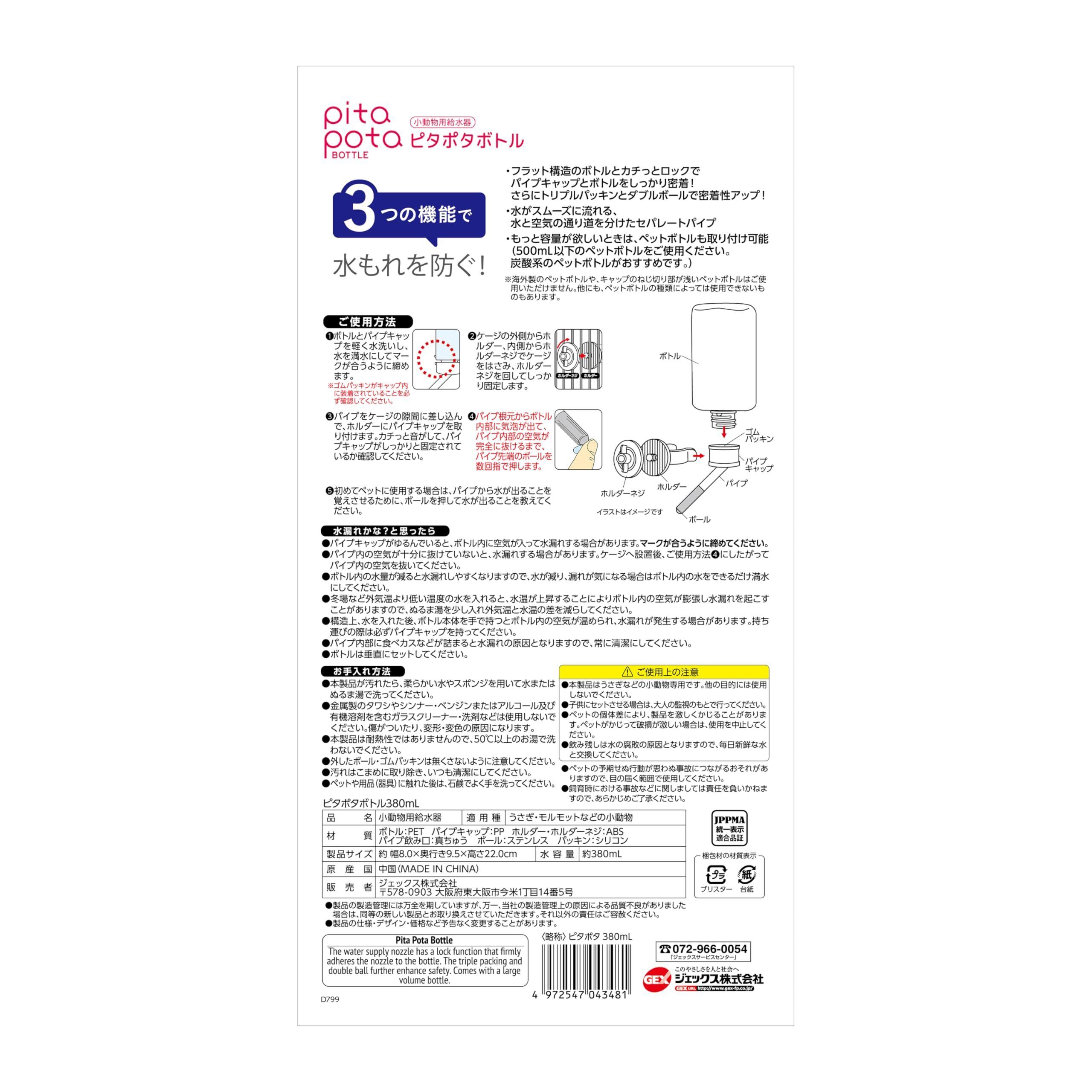 ジェックス ピタポタボトル380mL 給水器 ウォーターボトル 水漏れ防止 うさぎ・モルモット・小動物用